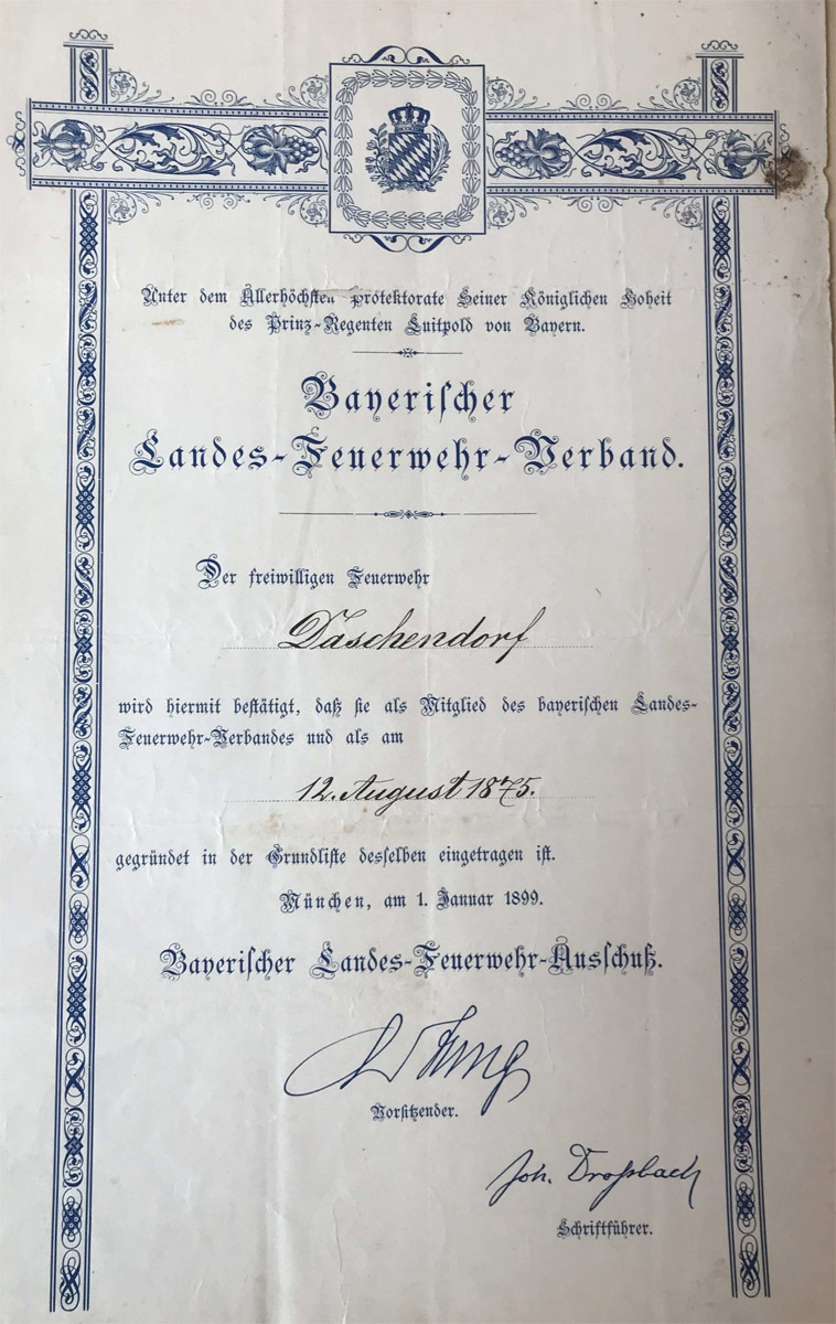 Fotos: Feuerwehr Daschendorf, Urkunde: Stadtarchiv Baunach