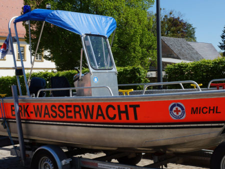Zusammen mit Evalies Meier, der Vorsitzenden des Kreisverbands Bamberg des Bayerischen Roten Kreuzes und Ortsgruppen-Vorstand Sebastian Schmitt nahm Müller anschließend einige Ehrungen vor. Dabei stachen besonders die Ehrungen für die Gründungsmitglieder Ignaz Zweier, Heinz Baier, Josef Hojer, Günter Müller und Waltraud Müller hervor. Jürgen Gleußner erhielt die Ehrennadel für 40 Jahre Engagement bei der Wasserwacht. Nach dem Festkommers gingen die Feierlichkeiten im Festzelt weiter – und Interessierte konnten sich den „Fuhrpark“ der Wasserwacht im benachbarten Schlosshof etwas genauer anschauen. Darunter: Das im Frühjahr 2012 geweihte Einsatzboot „Michl“ [8], das dem ehemaligen Vorstand Michael Bolibruch gewidmet wurde.