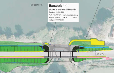Das Staatliche Bauamt Bamberg hat am Montag, 3. April 2017, mit der Erneuerung der Mainquerung südlich Baunach begonnen. Dieser Ausbaubereich beinhaltet drei Brückenbauwerke. Die Umsetzung erfolgt abschnittsweise, beginnend im Süden mit der Mainflutbrücke als ersten Bauabschnitt. Nach den vorbereitenden Maßnahmen folgt der Bau der Behelfsumfahrung.
