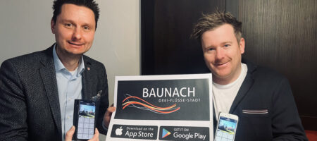 Im Titelbild: Bürgermeister Tobias Roppelt (l.) präsentiert stolz zusammen mit Stefan Wild von Sewisoft (r.) die neue Baunacher App.
