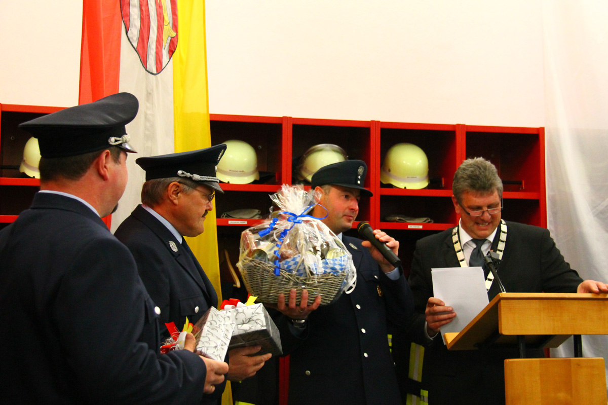Den Anlass nutzte Bürgermeister Ekkehard Hojer (r.), um die ehemaligen Kommandanten (v.l.) Christian Eck und Wernfred Scharting mit Dank und Ehren aus ihrem Amt zu verabschieden und die neuen Kommandanten Jürgen Dremel und Alexander Eck offiziell zu bestätigen.