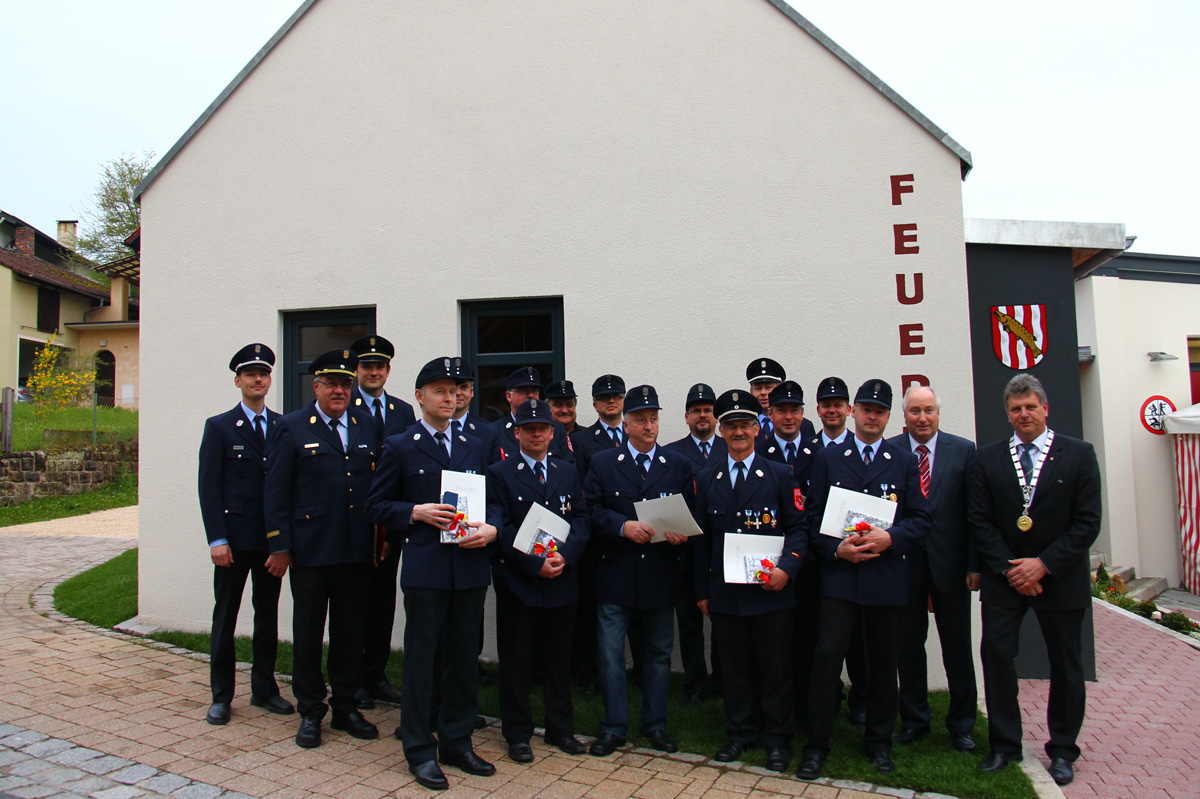 Nach der Segnung der Feuerwehrgerätehauses durch Dekan Stefan Gessner ehrten stellvertretender Landrat Georg Bogensperger, Kreisbrandrat Bernhard Ziegmann und Bürgermeister Ekkehard Hojer anwesende Feuerwehrmänner aus der gesamten Verwaltungsgemeinschaft Baunach für ihre langjährige aktive Dienstzeit.