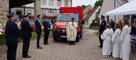 Vor dem Feuerwehrhaus wurde am Tag der Fahrzeugweihe zunächst ein Gottesdienst gefeiert. Und nach der anschließenden kirchlichen Segnung durch Kaplan P. David Susai verfügt die Feuerwehr des Baunacher Stadtteils Priegendorf nun auch offiziell über ihr neues „Tragkraftspritzenfahrzeug Logistik“ (TSF-L). Bei den jüngsten Einsätzen nach Starkregen war es schon mit dabei – und hat sich bewährt, wie von einigen Feuerwehrlern zu hören war.