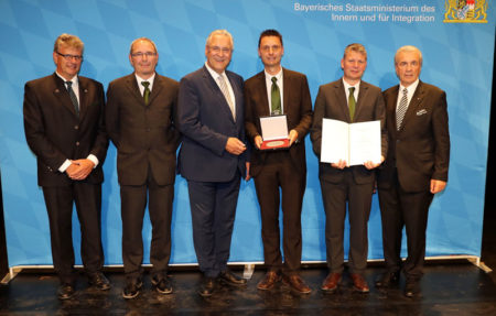 Minister Herrmann (3. von links) übergab die Auszeichnung.