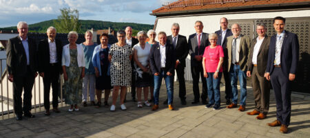 Im Titelbild: Alle anwesenden Geehrten der Festsitzung mit Bürgermeister Tobias Roppelt (rechts), zweitem Bürgermeister Peter Großkopf (7.v.l.) und drittem Bürgermeister Rudi Wacker (2.v.r.).
