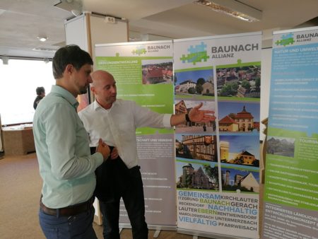 Felix Henneberger, Allianzmanager der Baunach-Allianz, stellte den anwesenden Bürgermeistern und Besuchern die Inhalte, Ziele und Projekte der Allianz vor. Außerdem verwies er auf die erstellten Werbematerialien zur Öffentlichkeitsarbeit, Flyer und Roll-Ups, sowie Taschen für die Begrüßung von Neubürgern. Des Weiteren stellte er das laufende Schülerprojekt mit einem Aktionstag aller Schüler der achten Klassen aller Schulen im Allianzgebiet am 25. September vor, die laufende Bauhofkooperation mit gemeinsamen Ausschreibungen und Schulungskalender sowie Lückenschlüsse im Radwegenetz und das Heben von Innenentwicklungspotentialen, Beseitigung von Leerständen und Gestaltung von Ortskernen mit Fördermittel des Amtes.