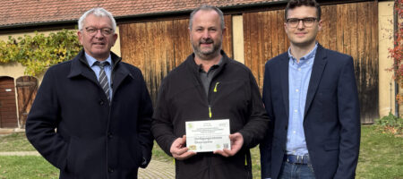 Im Titelbild: Förderschildübergabe für das Kleinprojekt im Bauernmuseum Bamberger Land (v.l.n.r.: Landrat Johann Kalb, Projektträger Christian Eck, Öko-Modellregion-Manager Patrick Nastvogel). (Quelle: Landratsamt Bamberg / Michel)