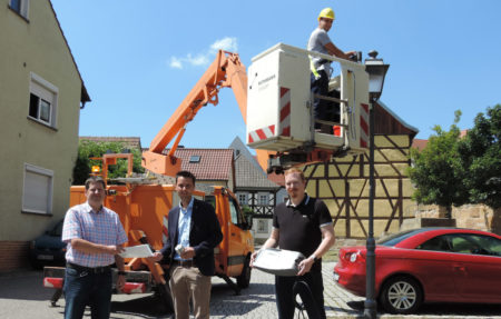 In Baunach wird gerade auf LED-Straßenbeleuchtung umgestellt. Bürgermeister Tobias Roppelt (Mitte) schaut sich die Arbeiten an.