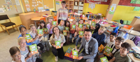 Im Titelbild: Übergabe der Möhrchenhefte mit Tobias Roppelt, Stefanie Leimeister, Maren Lorenzen-Fischer und der 2d.