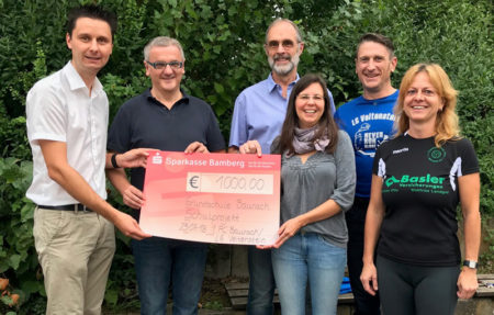 v.l. Tobias Roppelt (3. Bürgermeister Stadt Baunach), Rudolf Hennemann (Konrektor), Michael Wild (Rektor), Melanie Schmitt (Organisatorin des Stadtfestes), Michael Hertlein (Abt. Leiter LG Veitenstein) und Christine Dumsky (Abt. Leiterin FC Baunach Running) bei der Scheckübergabe.