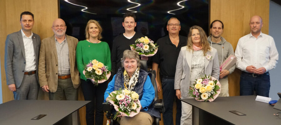 Im Titelbild: Bürgermeister Tobias Roppelt (links) bedankte sich bei (v.l.): Dritter Bürgermeister Rudi Wacker, Andrea Weigler, Benedikt Schug, Behindertenbeauftragte Sabine Saam (vorne), Elmar Gruß, Seniorenbeauftragte Renate Drütschel, Nachhaltigkeitsbeauftragten Heiko Schmitt. Rechts im Bild: Zweiter Bürgermeister Peter Großkopf.