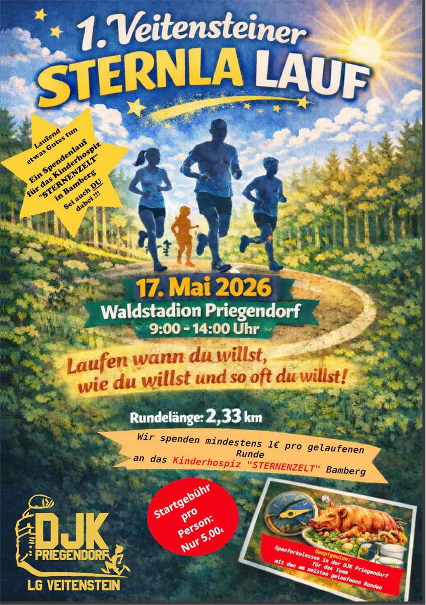 Nach über 20 Jahren erfolgreicher Lauftradition geht die LG Veitenstein, die Laufabteilung der DJK Priegendorf, neue Wege: Am 17. Mai 2026 feiert der 1. Veitensteiner Sternla-Lauf seine Premiere – und verbindet sportliches Engagement mit einem guten Zweck.