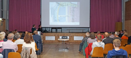 Bei der nun schon zweiten Veranstaltung zum Thema galt es auch wieder, die Bürgerinnen und Bürger „mitzunehmen“. Schon beim ersten Bürgerforum hatten sie aktiv ihre Ideen eingebracht, auch diesmal gab es einige Wortbeiträge. Dabei ging es beispielsweise um die Befürchtung, dass der Lärmschutzwall der Autobahn die Verkehrsgeräusche der neuen Erschließungsstraße Richtung vorhandene Wohnbebauung drücken könnte. Und auch die Integration der vorhandenen Baumbestände wurde angesprochen. Als weniger problematisch sahen einige Besucherinnen und Besucher wie Variante 2a, da hier die Erschließungsstraße näher an der Autobahn liegt.
