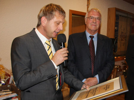 Ehrenmitglied Gerhard Kistner (links) mit seiner Urkunde für 50 Jahre ehrenamtliche Tätigkeit im Verein.