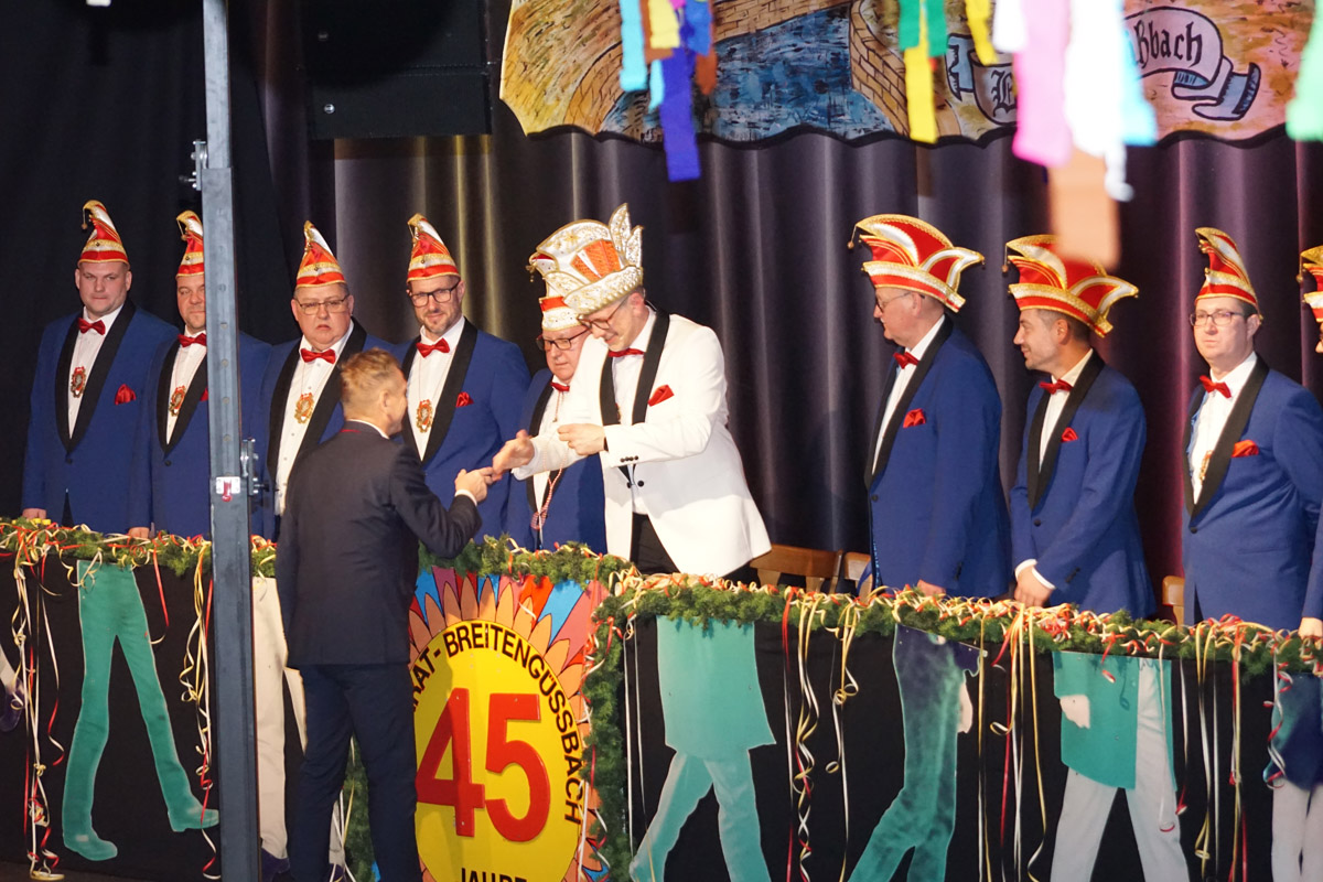 Eine sehr große Freude war es den Breitengüßbachern, Delegationen der ARGE Landkreisfasching begrüßen zu können – aus Hirschaid und Memmelsdorf unter anderem das Prinzenpaar und die Sitzungspräsidentin beziehungsweise den Sitzungspräsidenten. Und zum ersten Mal waren auch Vertreter aus Stegaurach und von der Trunstadter Karnevalsgesellschaft „Ritter vom Hahn“ zugegen. „Eigentlich überschneiden sich unsere Sitzungen ja immer, endlich könnt ihr nun auch mal bei uns sein“, so Sitzungspräsident Andreas Laubsch.