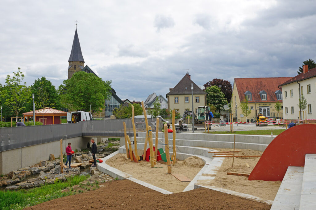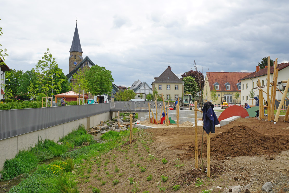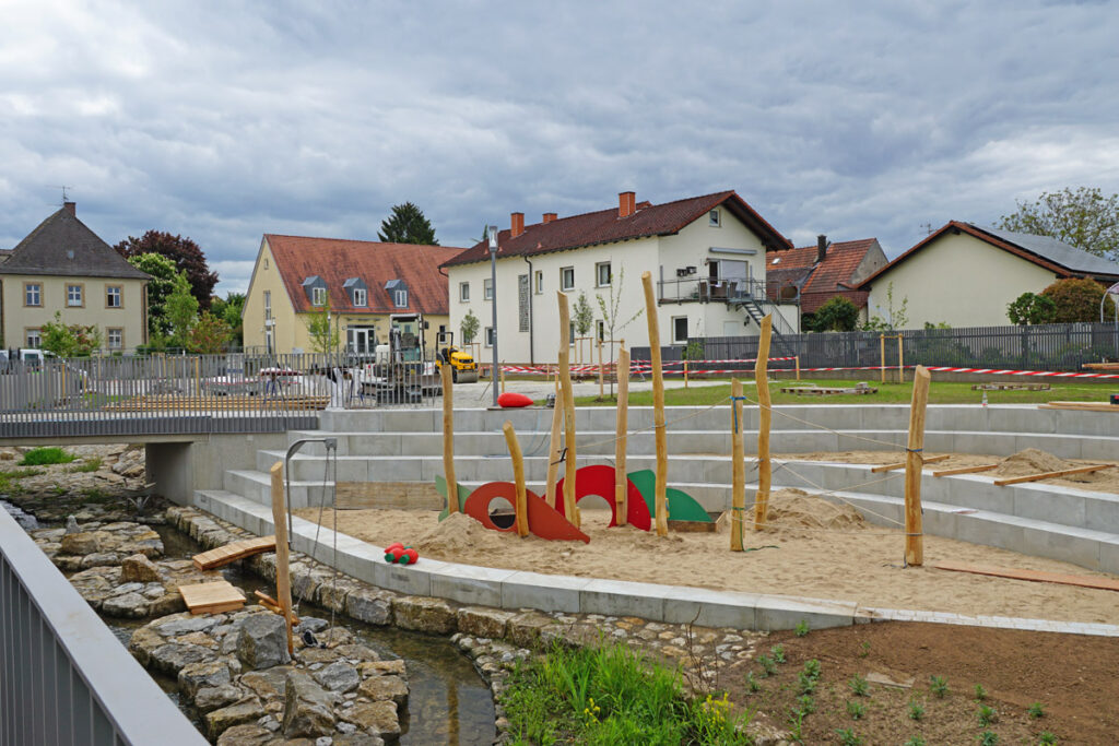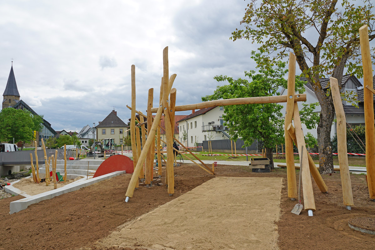 Bauamtsleiter Markus Schmitt betont beim Rundgang, der entlang des Güßbachs bis zur Bühlstraße, am Spielplatz vorbei über den Festplatz und wieder zurück zum Rathaus führt, wie schwierig die Baustelle oft war. Denn unter „laufendem Betrieb“ zu bauen ist immer etwas ganz anderes als etwa ein Neubaugebiet hochzuziehen. Das Wasser im nun geöffneten Güßbach lässt sich nicht einfach stoppen, unter der Erde finden sich zahlreiche Ver- und Entsorgungsleitungen – aus diesem Grund begann die Planung schon im Untergrund. Noch vor wenigen Tagen war Schmitt mit seinem Sohn selbst am Bachlauf aktiv, um Sand zu entfernen, der sich beim Abstrahlen des Pflasters angesammelt hatte. Viele Stunden hat er auf der Baustelle verbracht, vom Rathaus dank der Nähe immer wieder vorbeigeschaut. Nun steht er zusammen mit Reinfelder unterhalb des Spielplatzes an einer Stelle, wo früher die Autos auf der Austraße vorbeifuhren – und begutachtet den spielerisch inszenierten Rübenwaschplatz. Ein solcher fand sich hier, wenige Meter entfernt, früher wirklich einmal. Eine tolle historische Reminiszenz.