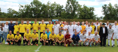 Die Wertschätzung, die der vor zweieinhalb Jahren beim Joggen so plötzlich verstorbene Eugen Ott bei seinen Mitspielern in verschiedenen Vereinen besaß bzw. besitzt, zeigte sich beim Einlagespiel, da sich zunächst über 20 Ex-Kameraden gemeldet hatten, letztlich 18 in die Trikots schlupften, die alle dessen Namenszug und Trikotnummer trugen. So entwickelte sich ein munteres Spielchen mit einigen Kabinettstückchen und vielen Toren. (SR.: R. Herl)