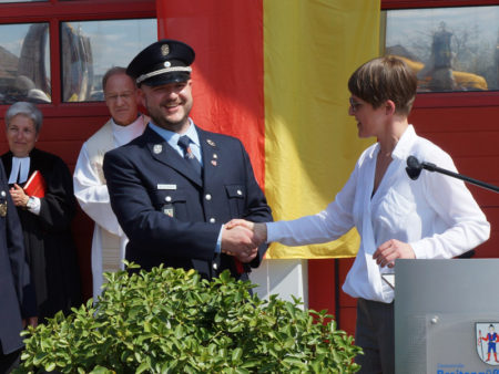 Kommandant Matthias Eichhorn informierte in seinen Grußworten über die Einsatzmöglichkeiten des HLF 20/16, angefangen bei der Personenrettung oder bei Unwettern. Denn es verfügt auch über eine Schmutzwasserpumpe. Zusätzlich steht eine Beleuchtungsausrüstung bereit, um etwa Unfallstellen bei Nacht übersichtlicher zu machen. Man habe sich bei der Zusammenstellung durch einen regelrechten „Angebotsdschungel“ kämpfen müssen, so Eichhorn.