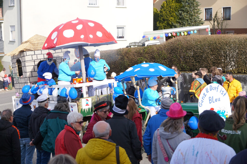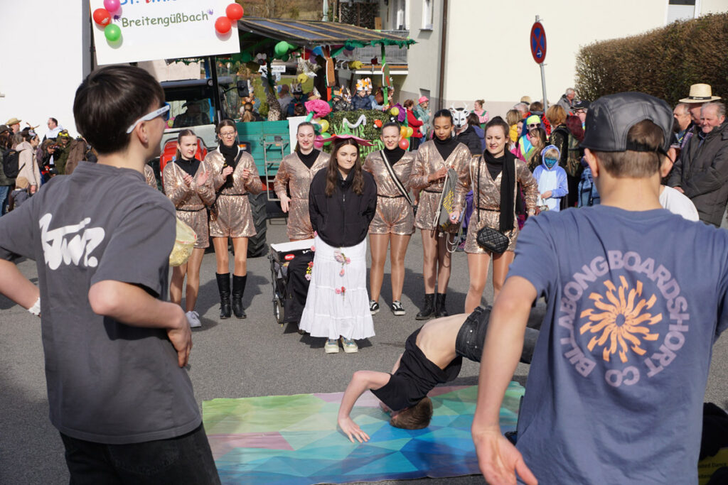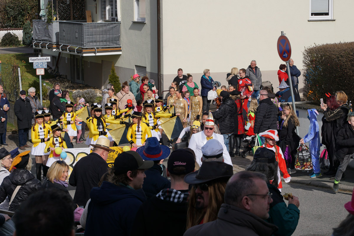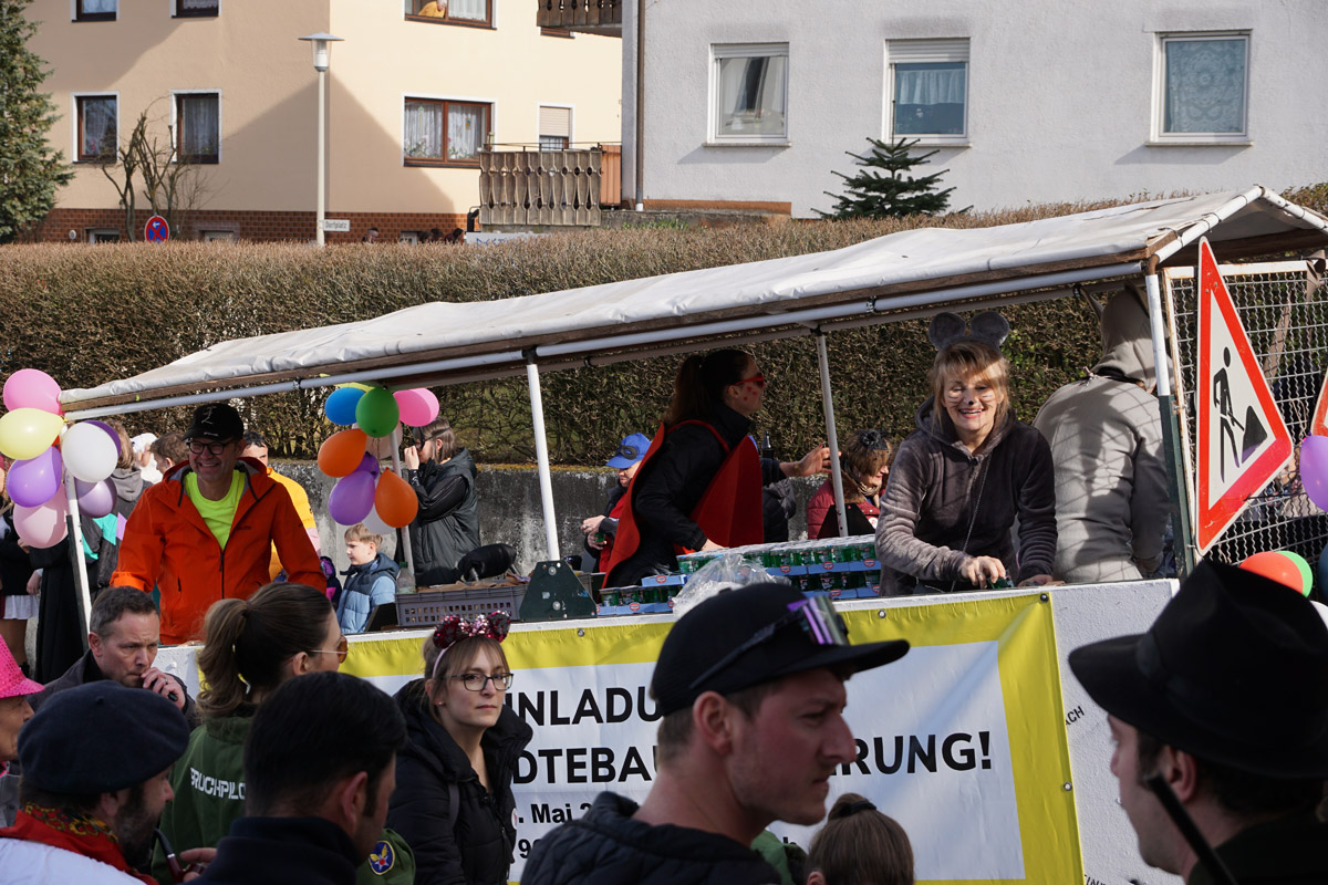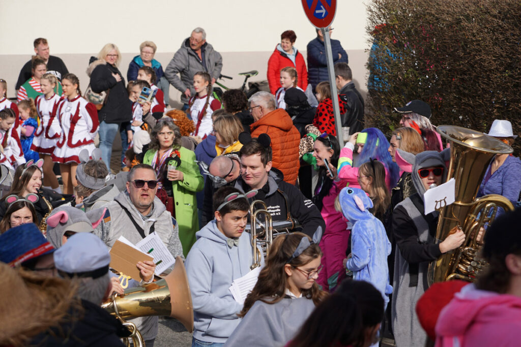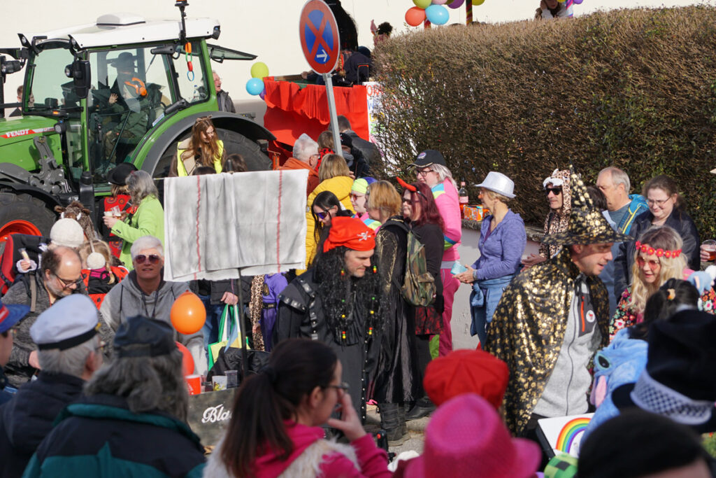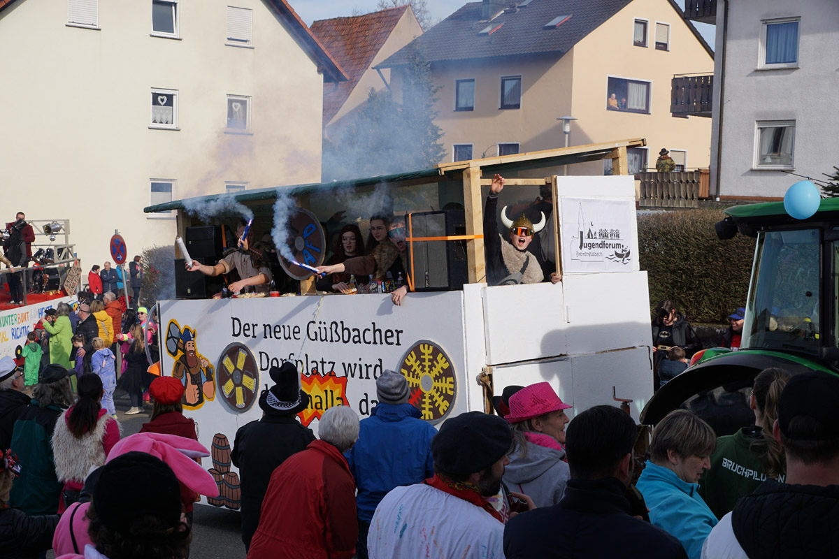 Erneut sehr lokal mit vielen Vereinen, KiTas und mehr präsentierte sich der Faschingsumzug. Angeführt wurde er zum 25. Mal von Georg Jüngling, unterstützt von den Schildmädchen Emilia und Selina. Direkt dahinter schwang das United Dance Team die Fahnen. Bürgermeisterin Sigrid Reinfelder lief als das „Güßbacher Wappenmännla“ mit, und die Gemeinde hatte sich auf ihrem Wagen das Thema Ortskern zu Eigen gemacht. Schließlich soll im Mai der neu gestaltete Bereich eingeweiht werden. Auch das Jugendforum freute sich auf dem Faschingswagen auf die neue Ortsmitte.