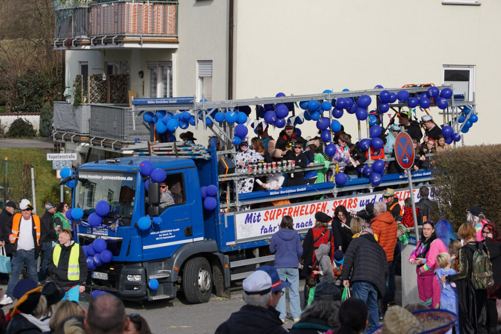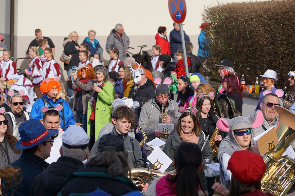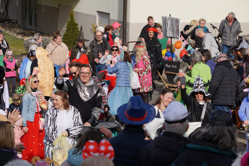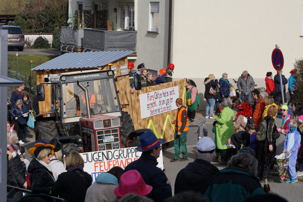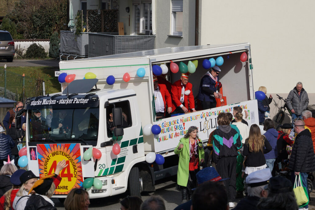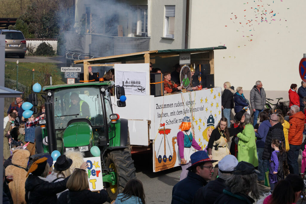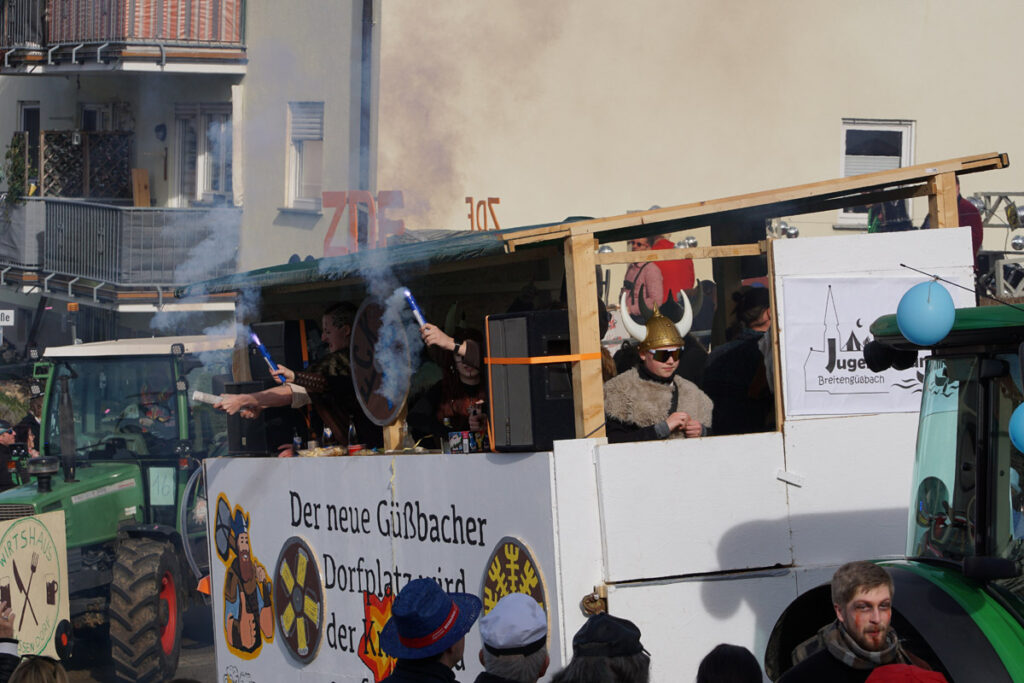 Erneut sehr lokal mit vielen Vereinen, KiTas und mehr präsentierte sich der Faschingsumzug. Angeführt wurde er zum 25. Mal von Georg Jüngling, unterstützt von den Schildmädchen Emilia und Selina. Direkt dahinter schwang das United Dance Team die Fahnen. Bürgermeisterin Sigrid Reinfelder lief als das „Güßbacher Wappenmännla“ mit, und die Gemeinde hatte sich auf ihrem Wagen das Thema Ortskern zu Eigen gemacht. Schließlich soll im Mai der neu gestaltete Bereich eingeweiht werden. Auch das Jugendforum freute sich auf dem Faschingswagen auf die neue Ortsmitte.