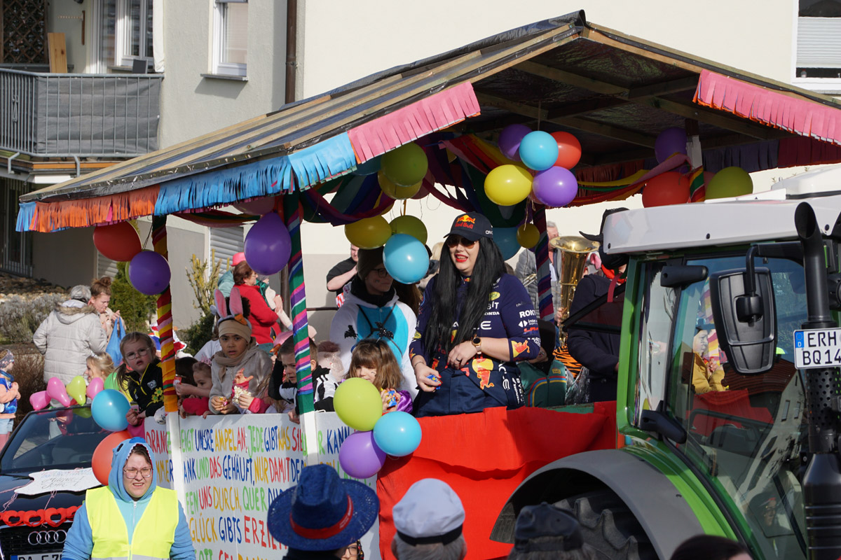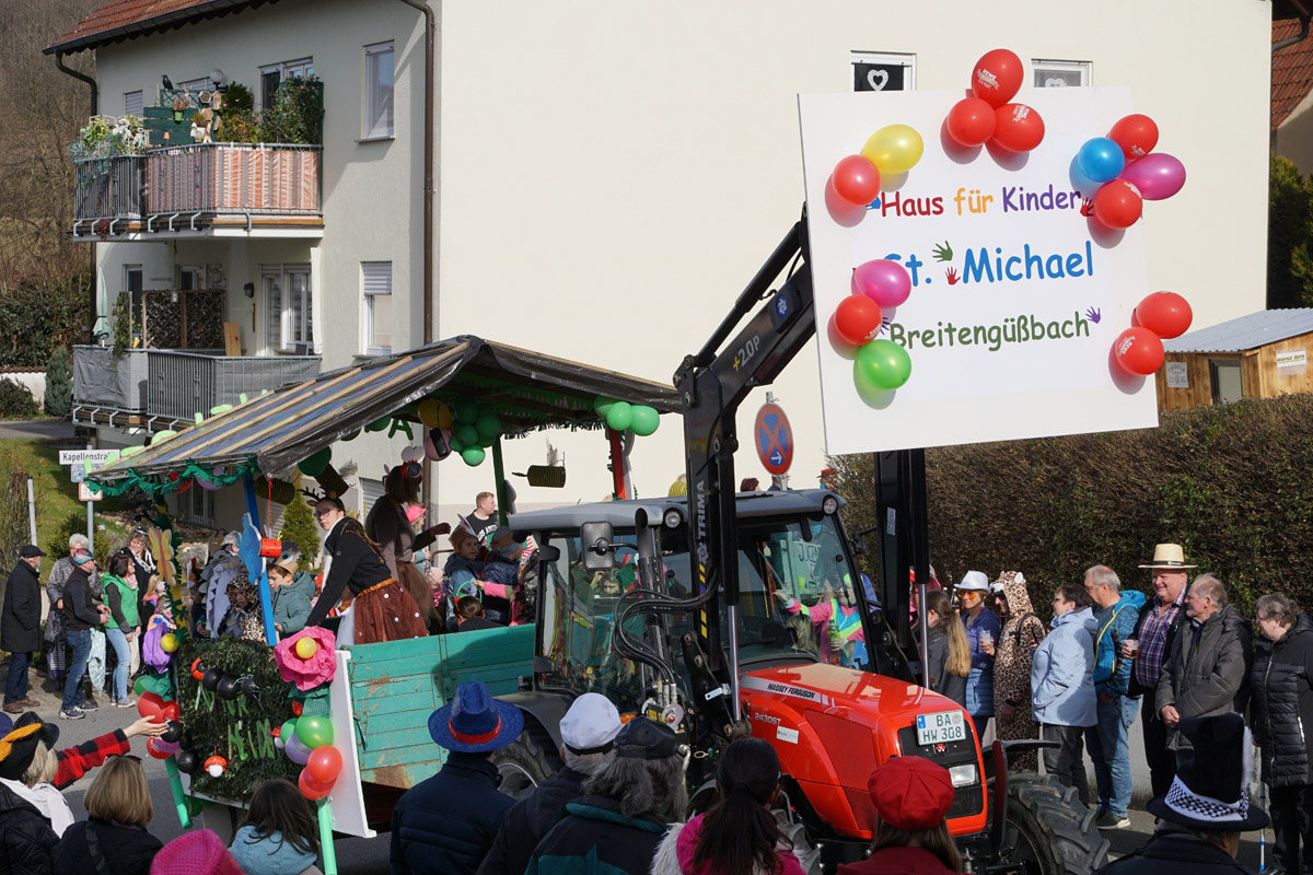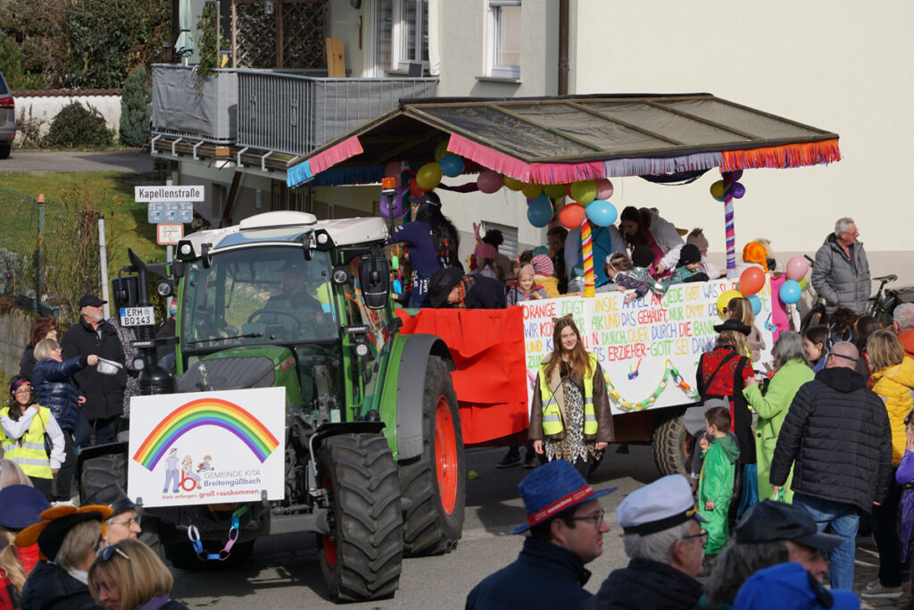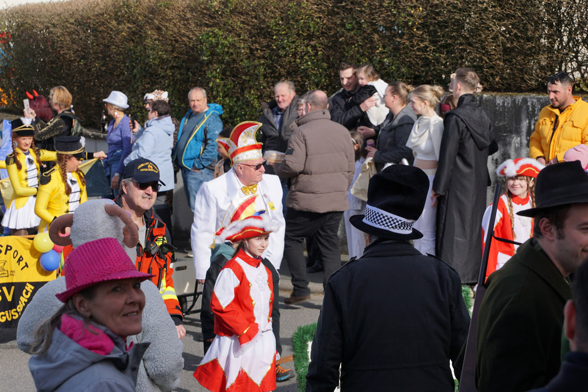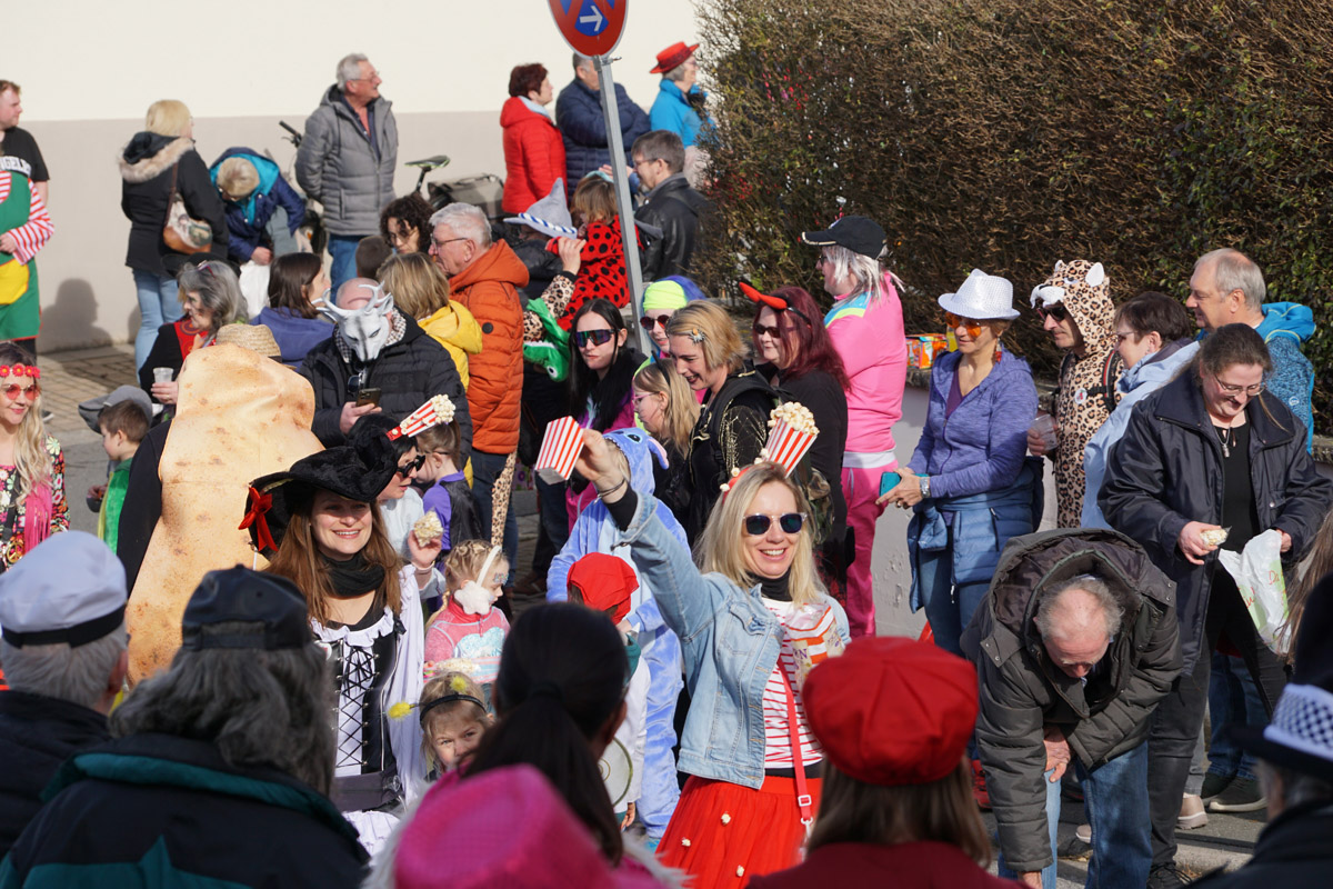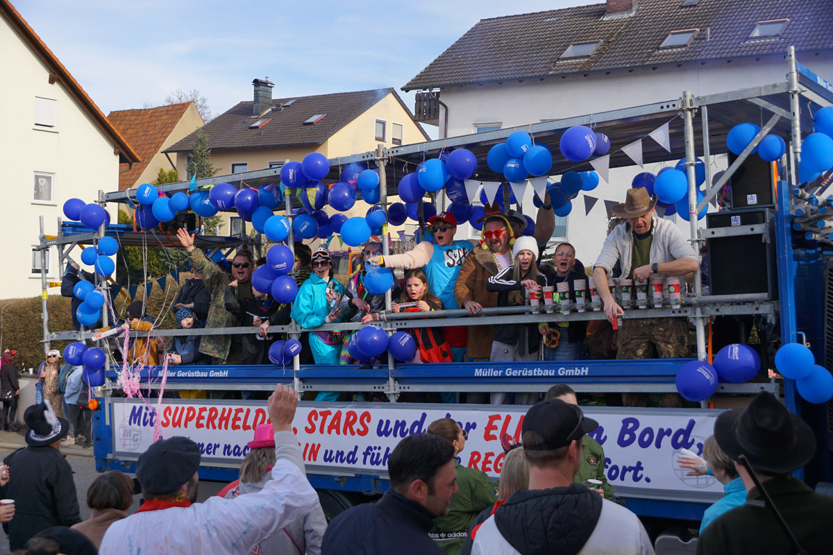 Erneut sehr lokal mit vielen Vereinen, KiTas und mehr präsentierte sich der Faschingsumzug. Angeführt wurde er zum 25. Mal von Georg Jüngling, unterstützt von den Schildmädchen Emilia und Selina. Direkt dahinter schwang das United Dance Team die Fahnen. Bürgermeisterin Sigrid Reinfelder lief als das „Güßbacher Wappenmännla“ mit, und die Gemeinde hatte sich auf ihrem Wagen das Thema Ortskern zu Eigen gemacht. Schließlich soll im Mai der neu gestaltete Bereich eingeweiht werden. Auch das Jugendforum freute sich auf dem Faschingswagen auf die neue Ortsmitte.