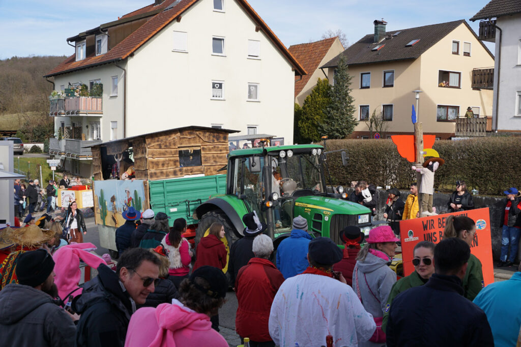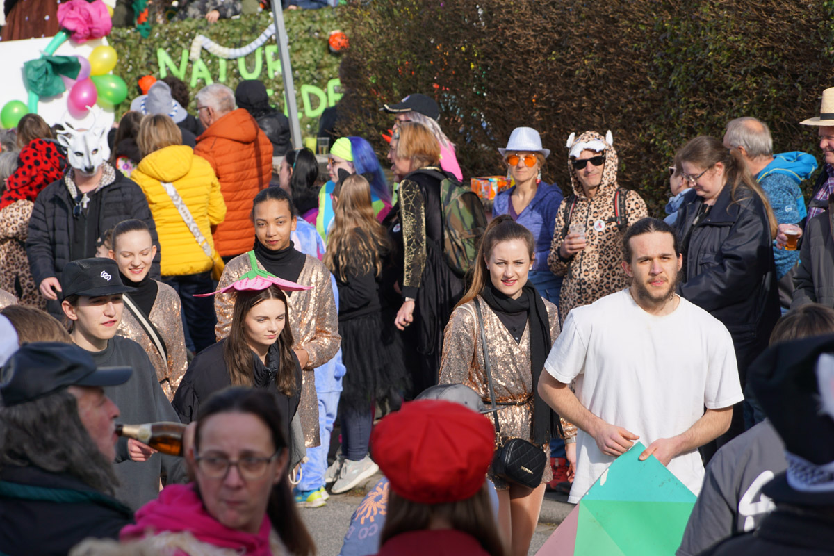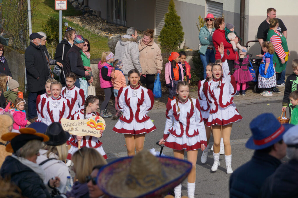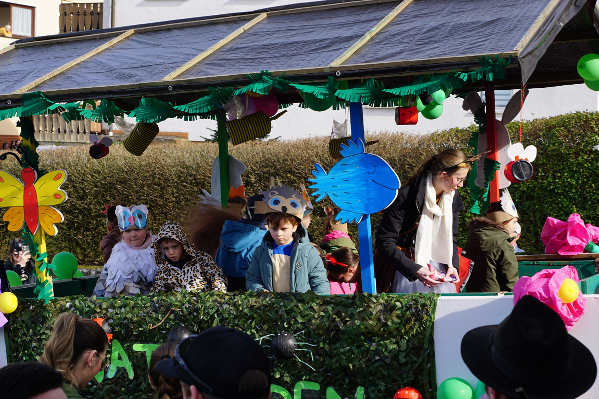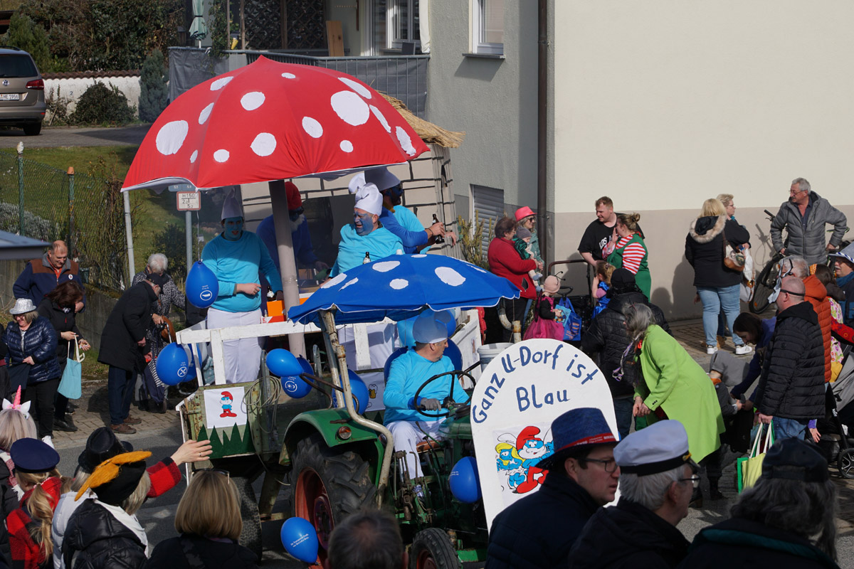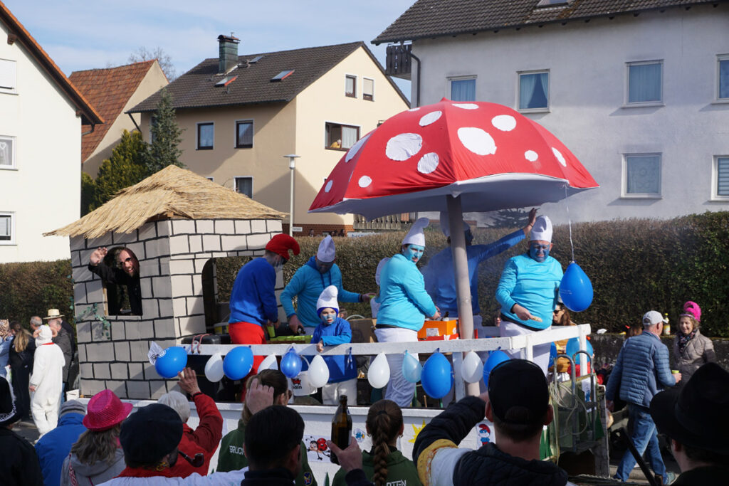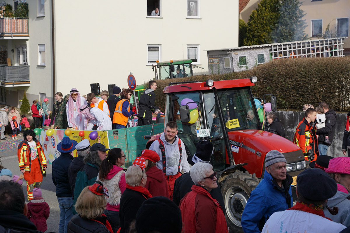 Erneut sehr lokal mit vielen Vereinen, KiTas und mehr präsentierte sich der Faschingsumzug. Angeführt wurde er zum 25. Mal von Georg Jüngling, unterstützt von den Schildmädchen Emilia und Selina. Direkt dahinter schwang das United Dance Team die Fahnen. Bürgermeisterin Sigrid Reinfelder lief als das „Güßbacher Wappenmännla“ mit, und die Gemeinde hatte sich auf ihrem Wagen das Thema Ortskern zu Eigen gemacht. Schließlich soll im Mai der neu gestaltete Bereich eingeweiht werden. Auch das Jugendforum freute sich auf dem Faschingswagen auf die neue Ortsmitte.