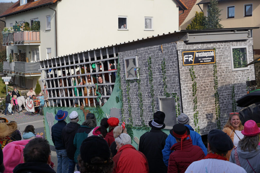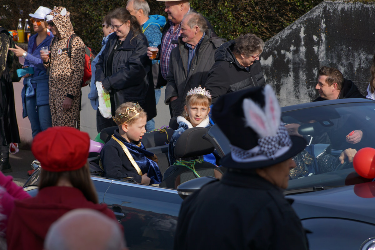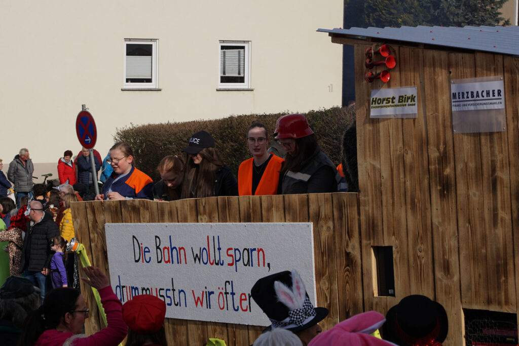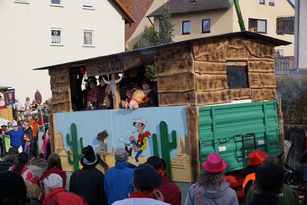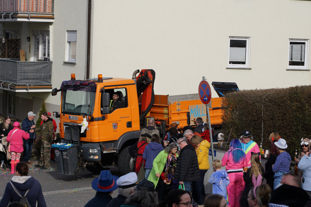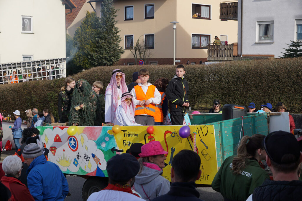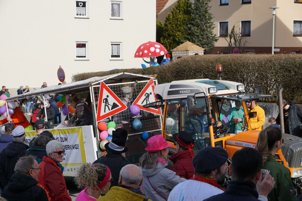 Erneut sehr lokal mit vielen Vereinen, KiTas und mehr präsentierte sich der Faschingsumzug. Angeführt wurde er zum 25. Mal von Georg Jüngling, unterstützt von den Schildmädchen Emilia und Selina. Direkt dahinter schwang das United Dance Team die Fahnen. Bürgermeisterin Sigrid Reinfelder lief als das „Güßbacher Wappenmännla“ mit, und die Gemeinde hatte sich auf ihrem Wagen das Thema Ortskern zu Eigen gemacht. Schließlich soll im Mai der neu gestaltete Bereich eingeweiht werden. Auch das Jugendforum freute sich auf dem Faschingswagen auf die neue Ortsmitte.