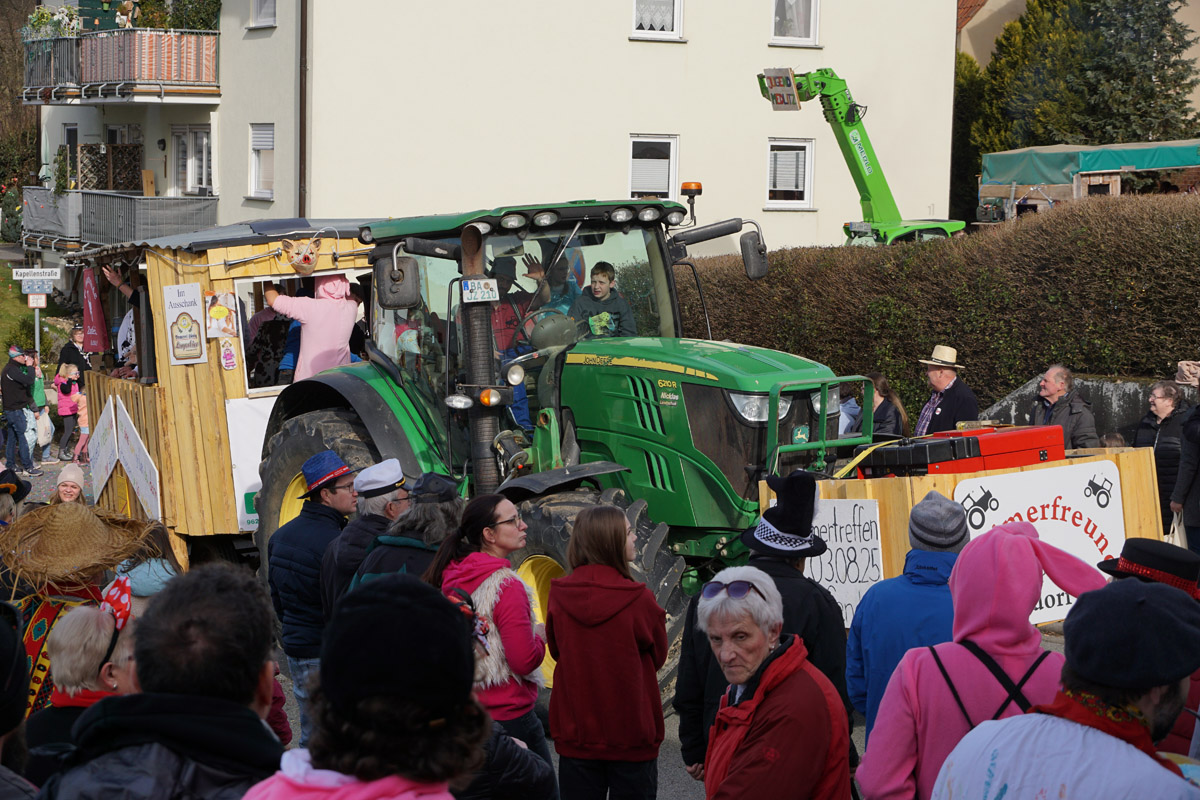 Auch Gäste konnte Moderator Georg Gunzelmann, der nach mehr als zehn Jahren Pause wieder am Mikrofon stand, begrüßen. Die Laafer Junga aus Lauf, die Feuerwehr sowie die Oldtimerfreunde Zapfendorf, die Fränkischa Rauschküh aus Reckendorf, die Feuerwehr Rattelsdorf, die Jugend aus Medlitz sowie Gerüstbau Müller aus Rattelsdorf. Insgesamt kam der Umzug damit dieses Jahr auf 31 Gruppen. Andreas Schuster, erster Vorsitzender der Faschingsvereinigung Unteroberndorf, hatte auch noch eine interessante Zahl mit dabei: Mehr als eine halbe Tonne Süßigkeiten wurden für den Umzug zum Auswerfen eingekauft. Das entspricht einer ganze Palette voller Süßigkeiten …