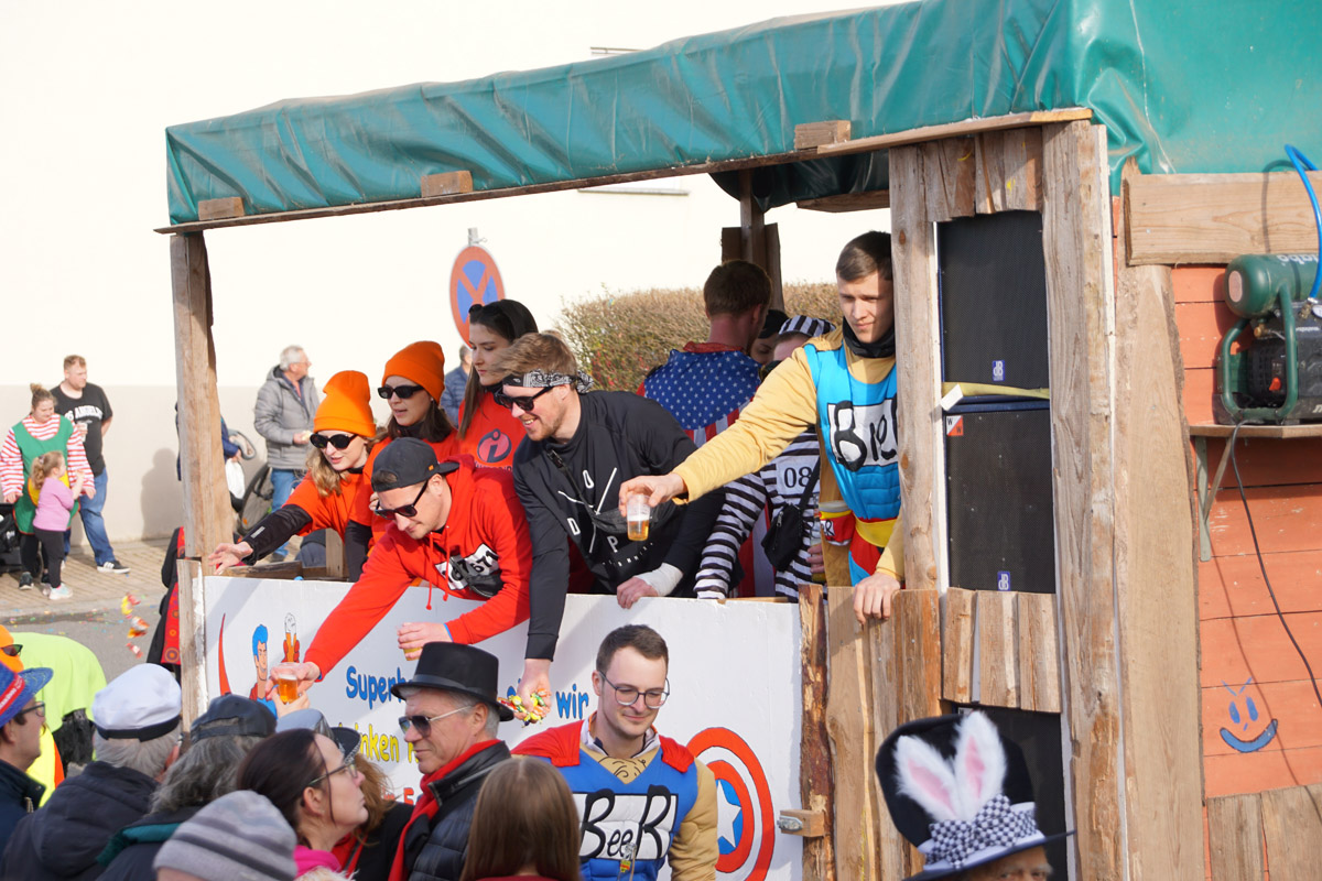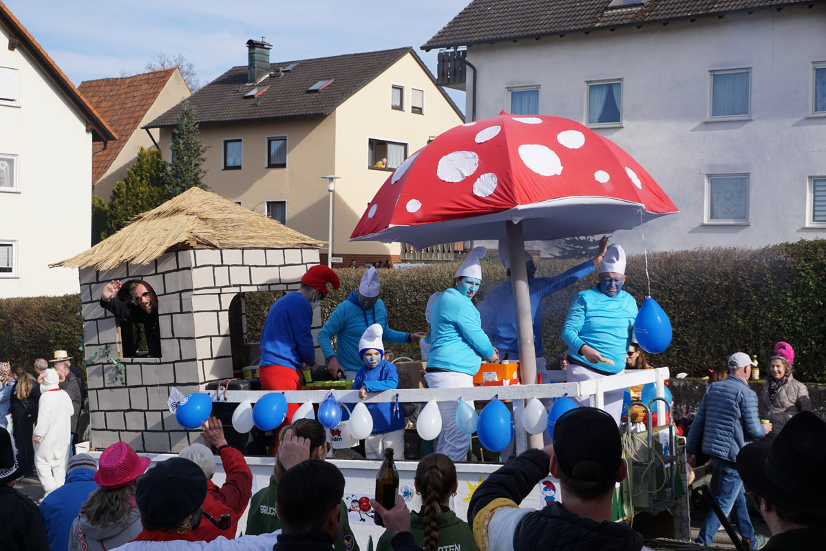 Blau war ganz U’Dorf auf dem Wagen von Stefan Gunzelmann beim Thema „Schlümpfe“. Der Elferrat Breitengüßbach hatte natürlich die eigene Prunksitzung als Motto, die in diesem Jahr bei ausverkaufter Halle wieder ein voller Erfolg war. Mit dabei waren auch die beiden Kindertagesstätten in der Gemeinde Breitengüßbach mit zwei Wägen und zwei Fußgruppen. Und weil die Bahn wohl sparen wollte, musste die Freiwillige Feuerwehr Unteroberndorf schon mehrfach wegen eines Bibers im Regenrückhaltebecken ausrücken – klar, dass das ein Aufhänger für den Faschingswagen der Jugendgruppe der Feuerwehr war.