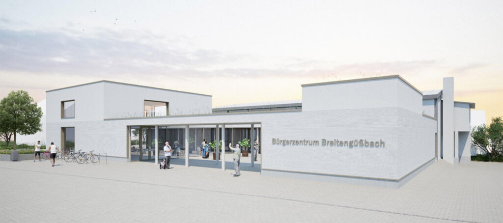 Im Titelbild: Die Variante 2 für das Bürgerzentrum – mit einem arkadenähnlichen Eingangsbereich in den Innenhof. Im hinteren Bereich liegt die Gemeindeturnhalle, die erhalten bleiben soll. Quelle: Eichhorn + Partner Architekten