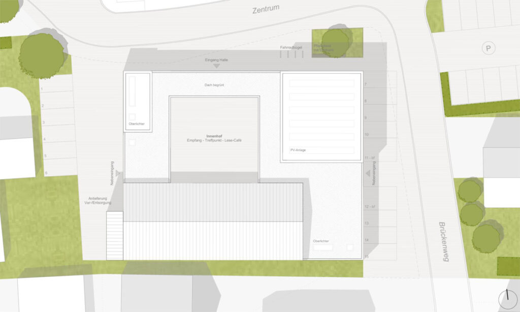 Einen anderen Weg geht die Variante 2, „Cluster“: Mehrere Gebäude – jeweils für Bücherei, Umkleiden sowie die Halle – gruppieren sich um einen Innenhof. Ein Gründach, ein überdachter Eingangsbereich und zusätzliche Bewegungs- und Multifunktionsräume im Obergeschoss gehören zum Konzept. Die grob geschätzten Kosten liegen bei etwa 7,5 Millionen Euro.