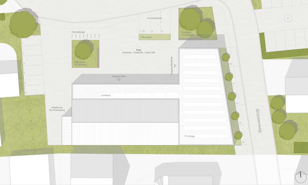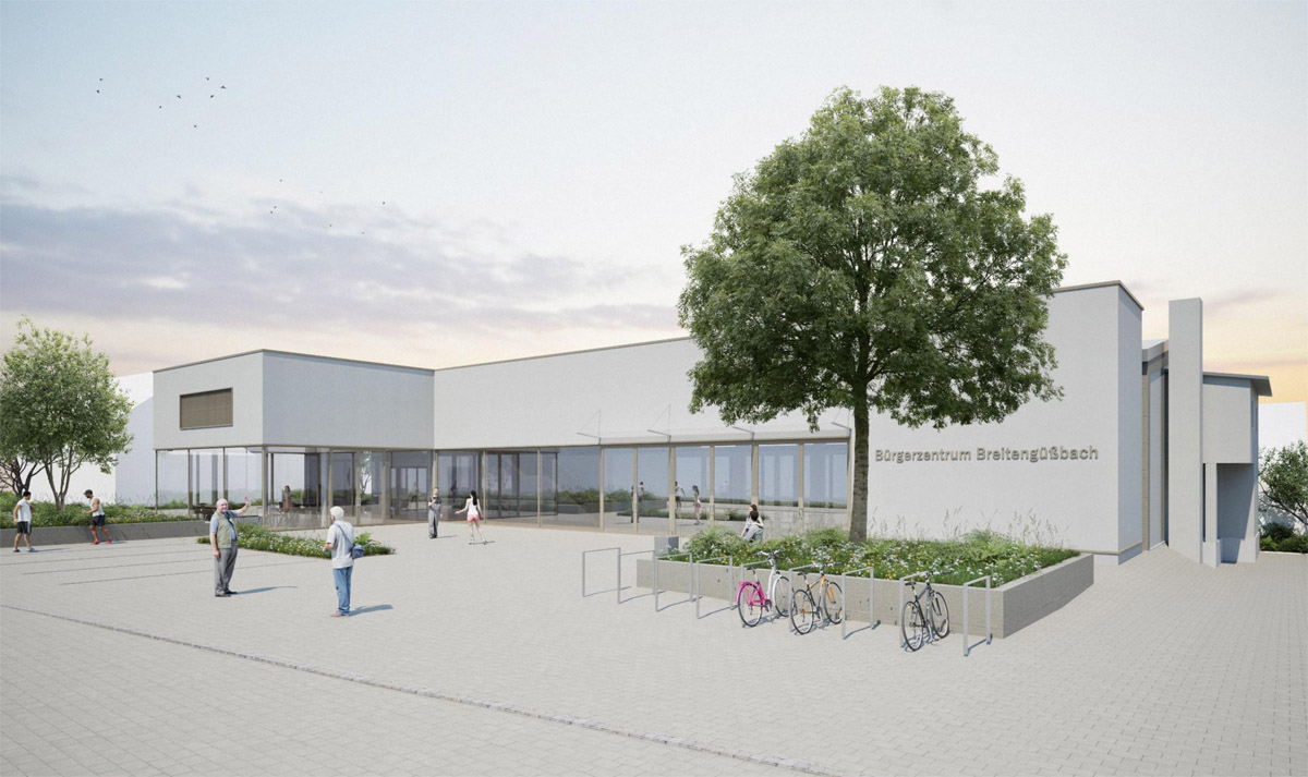 Die Variante 1 unter dem Schlagwort „Bewegung“ setzt stärker auf ein klassisches Gemeindezentrum. Sie sieht unter anderem den Rückbau des heutigen b-treff-Gebäudes vor, räumt mit einem großen Vorplatz mehr Luft ein und bündelt Bücherei, Multifunktionsraum und Bewegungsräume in einem neu strukturierten Baukörper. Die Grobkostenschätzung liegt bei rund 7,8 Millionen Euro. Zudem würde die Parkplatzsituation zwar neu geordnet, jedoch insgesamt reduziert. Die Parkplätze bleiben allgemein das Problem in diesem Bereich, lösen ließe sich das nur durch eine Tiefgarage, die aber nicht in Frage kommt.