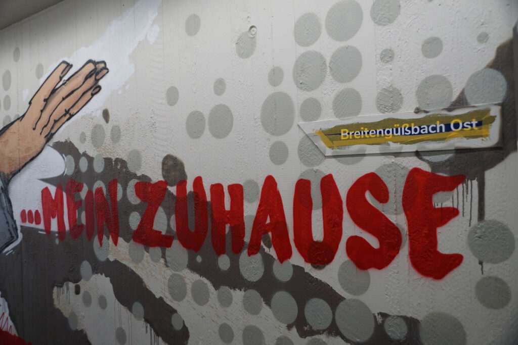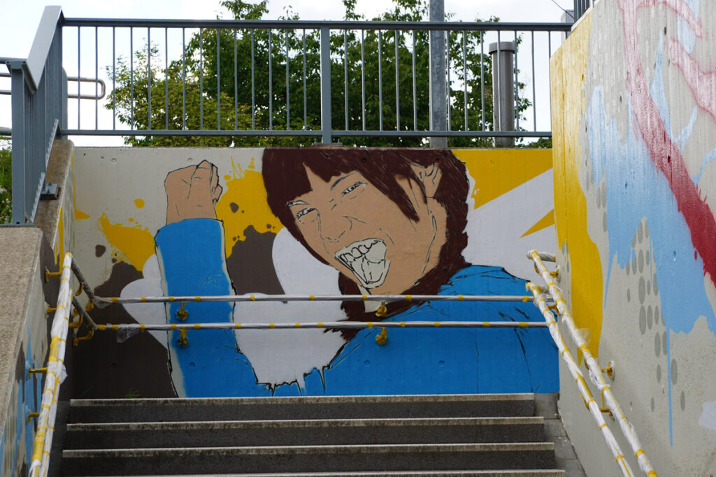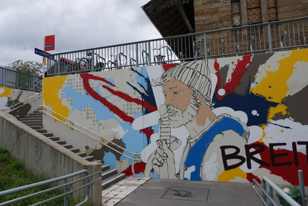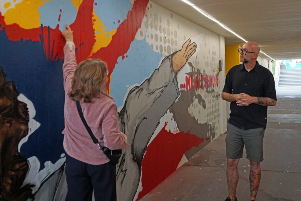 Die Neugestaltung bezieht auch die Außenwände der Unterführung mit ein. Wer genau hinschaut, wird in vielen Bereichen Motive entdecken, die typisch für Breitengüßbach sind – von Gebäuden bis hin zu Verweisen auf lokale Angebote und die Vereinstradition. Hier hatte sich Schwan deutlich intensiver mit Breitengüßbach auseinandergesetzt als die anderen Teilnehmer des Wettbewerbs. Auf Schwan gestoßen war Edith Obrusnik, die ein Kunstwerk von Schwan in Nienburg (Weser) entdeckt hatte.