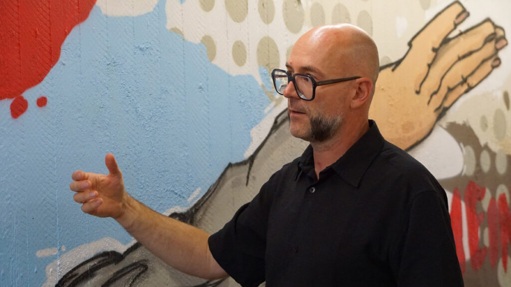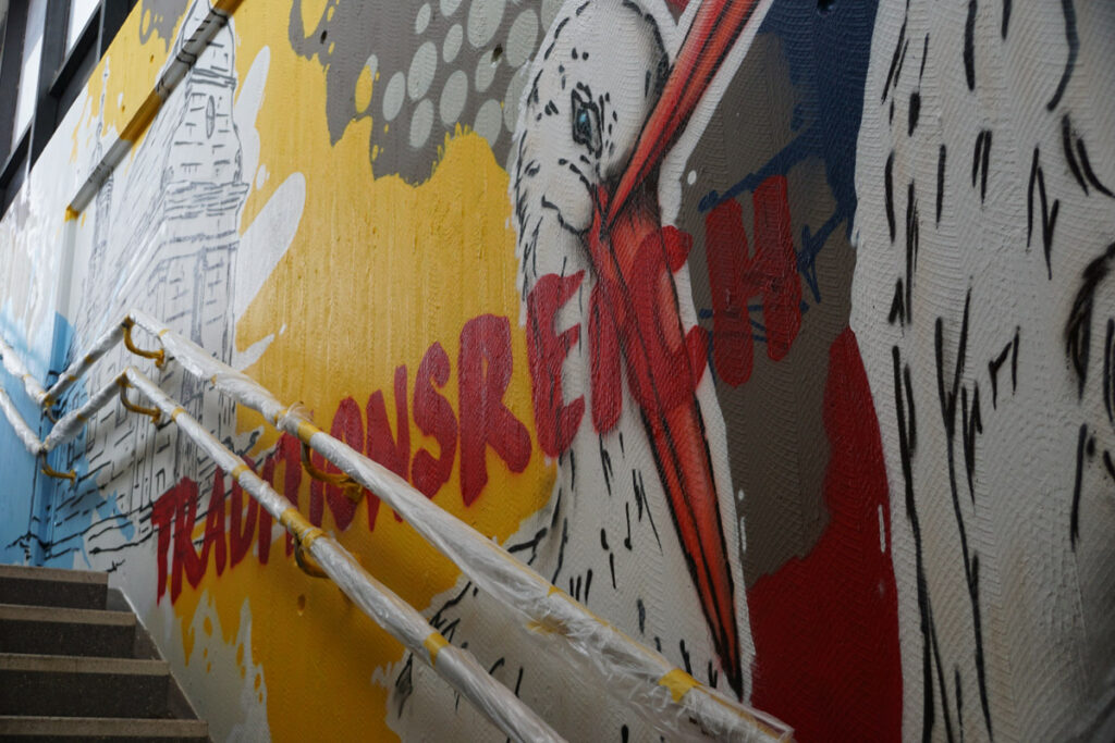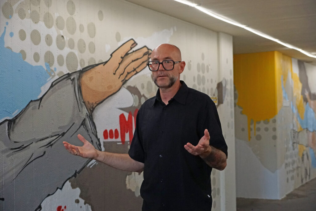 Technisch ist die Arbeit von Oliver Schwan ebenfalls interessant. Der Hintergrund wird gestrichen, dann bringt er die Grundzüge der Motive mithilfe einer VR-Brille auf – und am Ende wird mit Graffiti ausgemalt. Diese Technik spart viel Zeit, ansonsten wäre er, wie er berichtet, hier monatelang beschäftigt. Denn der Umfang des Kunstwerks ist enorm. Bewusst setzt er auf verlaufende Farben und verwendet Graffiti-Sprühdosen aus speziellen Geschäften für Künstlerbedarf. Ein ganzer blauer Sack leerer Dosen sei hier schon angefallen, so Schwan.