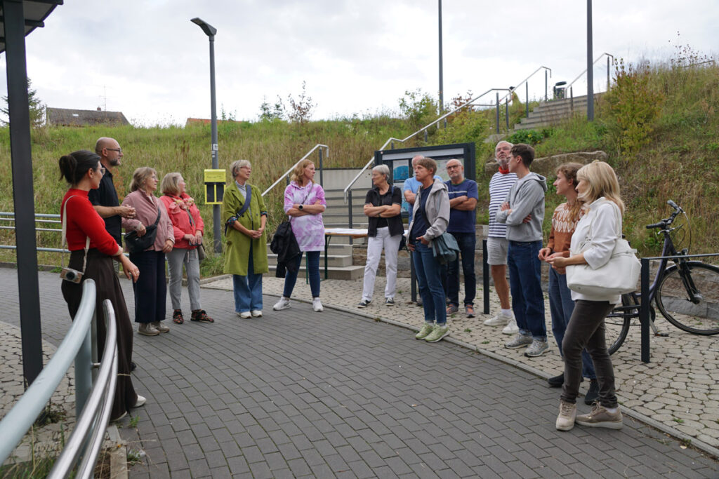 Warum macht man das nicht gleich so? Kunst, Farben, Licht – statt grauem Beton und dürftiger Beleuchtung? Diese Frage stellten sich viele der Besucherinnen und Besucher beim Termin „Triff den Künstler“, zu dem die Gemeinde Breitengüßbach am 2. September 2025 geladen hatte. Denn gerade ist Oliver Schwan aktiv und gestaltet die Bahnunterführung und auch den Aufgangsbereich zu den Gleisen komplett neu.