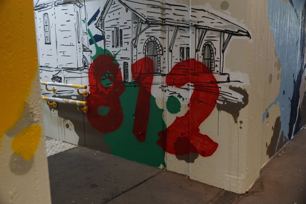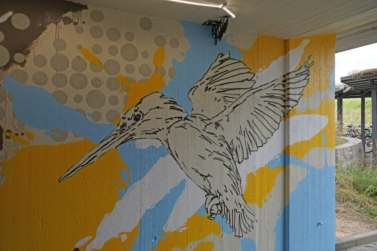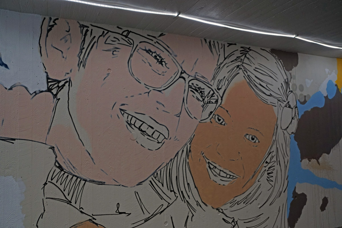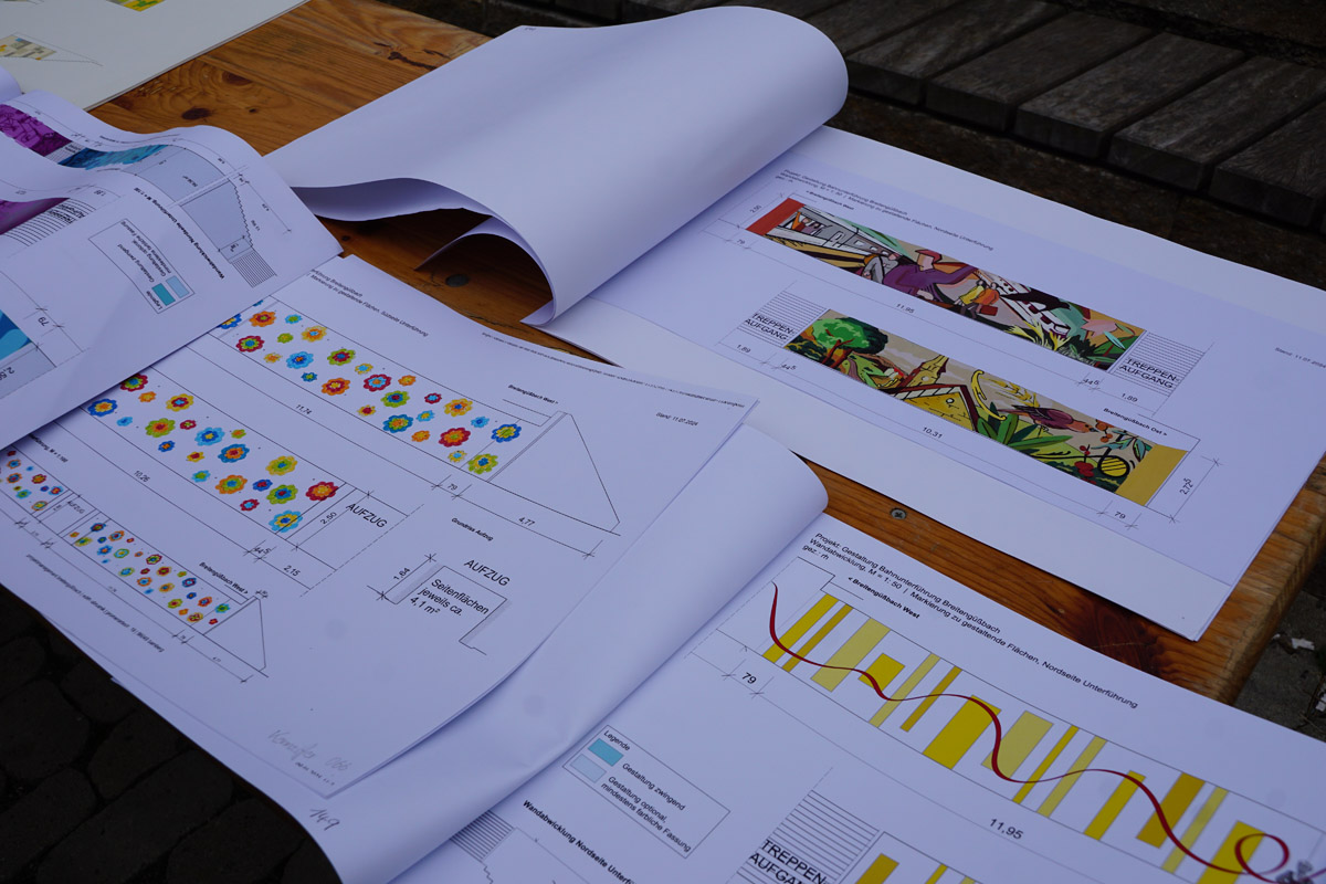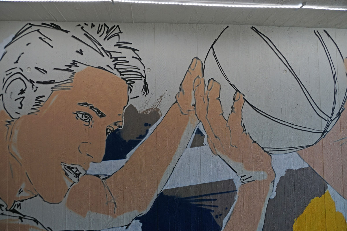 Die Neugestaltung bezieht auch die Außenwände der Unterführung mit ein. Wer genau hinschaut, wird in vielen Bereichen Motive entdecken, die typisch für Breitengüßbach sind – von Gebäuden bis hin zu Verweisen auf lokale Angebote und die Vereinstradition. Hier hatte sich Schwan deutlich intensiver mit Breitengüßbach auseinandergesetzt als die anderen Teilnehmer des Wettbewerbs. Auf Schwan gestoßen war Edith Obrusnik, die ein Kunstwerk von Schwan in Nienburg (Weser) entdeckt hatte.