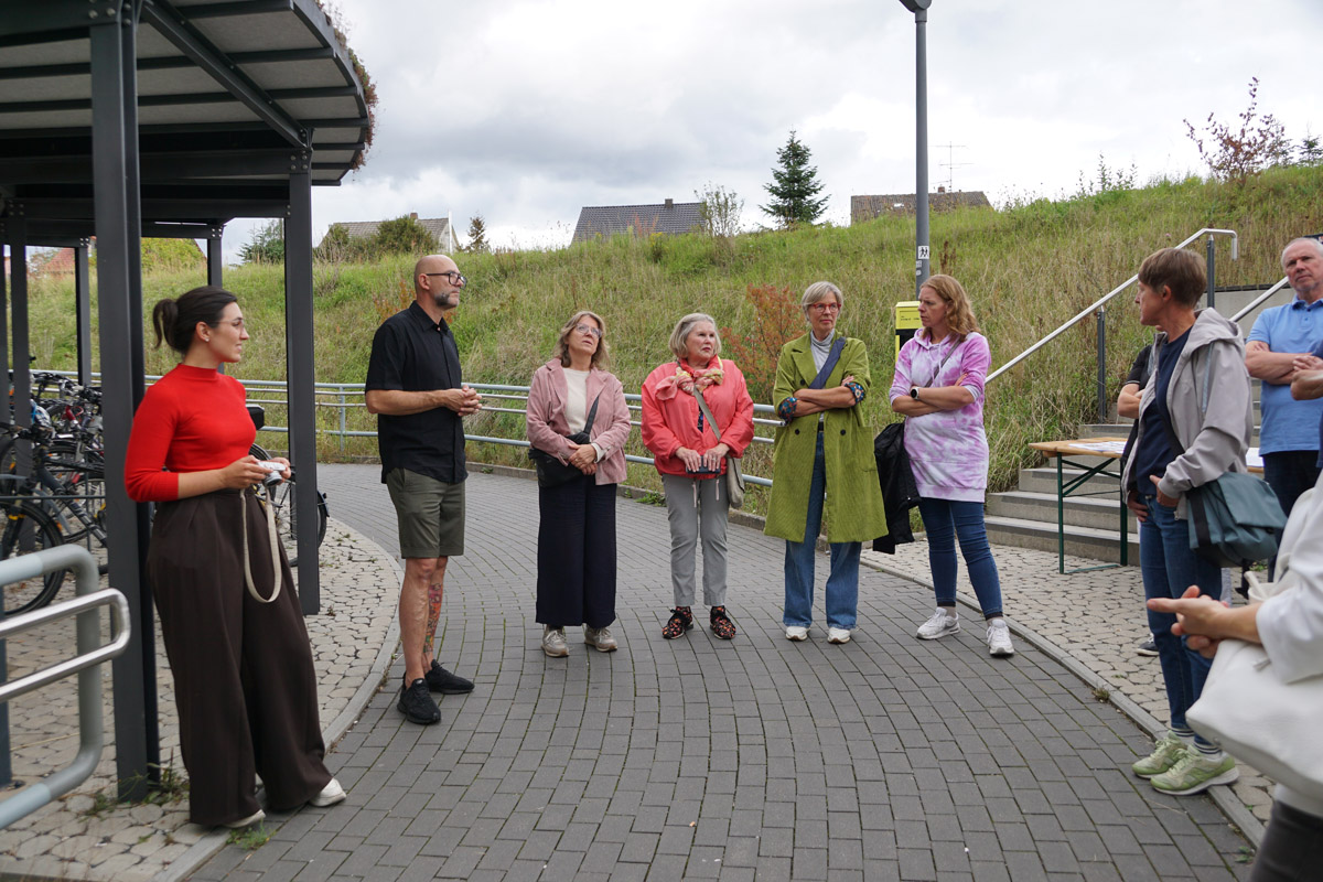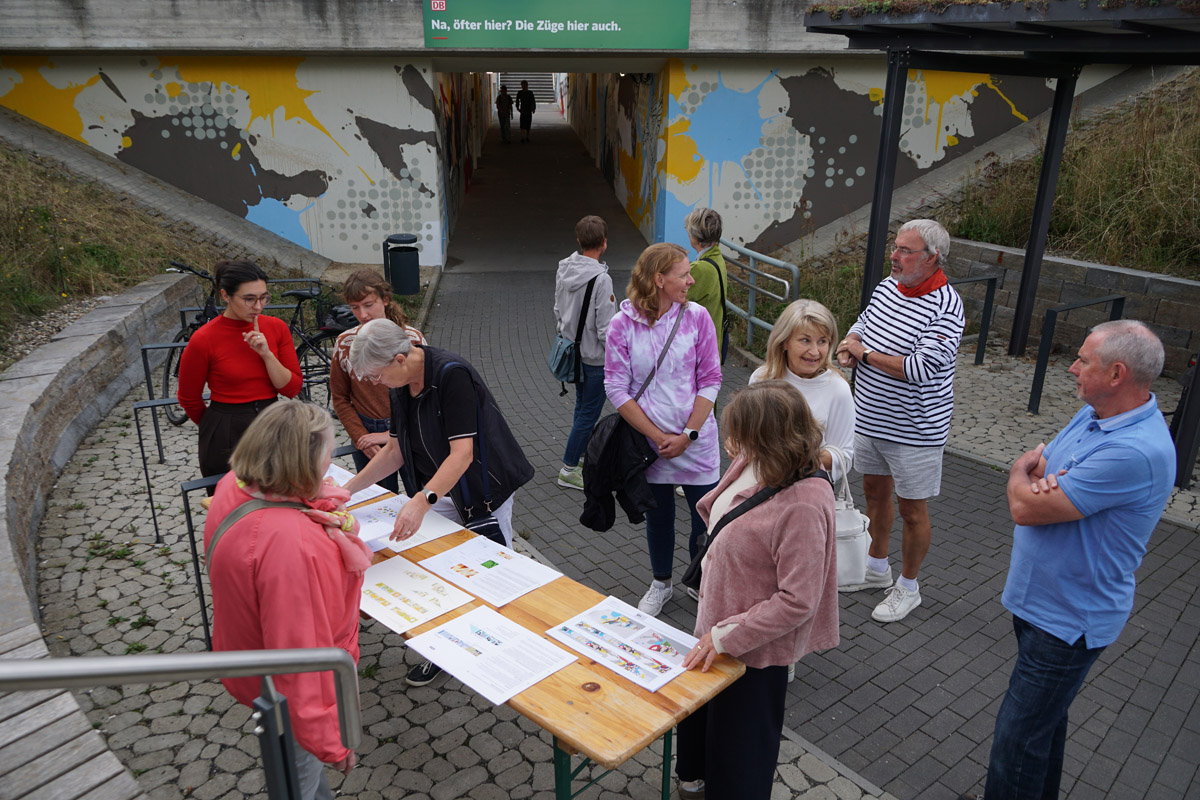 Warum macht man das nicht gleich so? Kunst, Farben, Licht – statt grauem Beton und dürftiger Beleuchtung? Diese Frage stellten sich viele der Besucherinnen und Besucher beim Termin „Triff den Künstler“, zu dem die Gemeinde Breitengüßbach am 2. September 2025 geladen hatte. Denn gerade ist Oliver Schwan aktiv und gestaltet die Bahnunterführung und auch den Aufgangsbereich zu den Gleisen komplett neu.