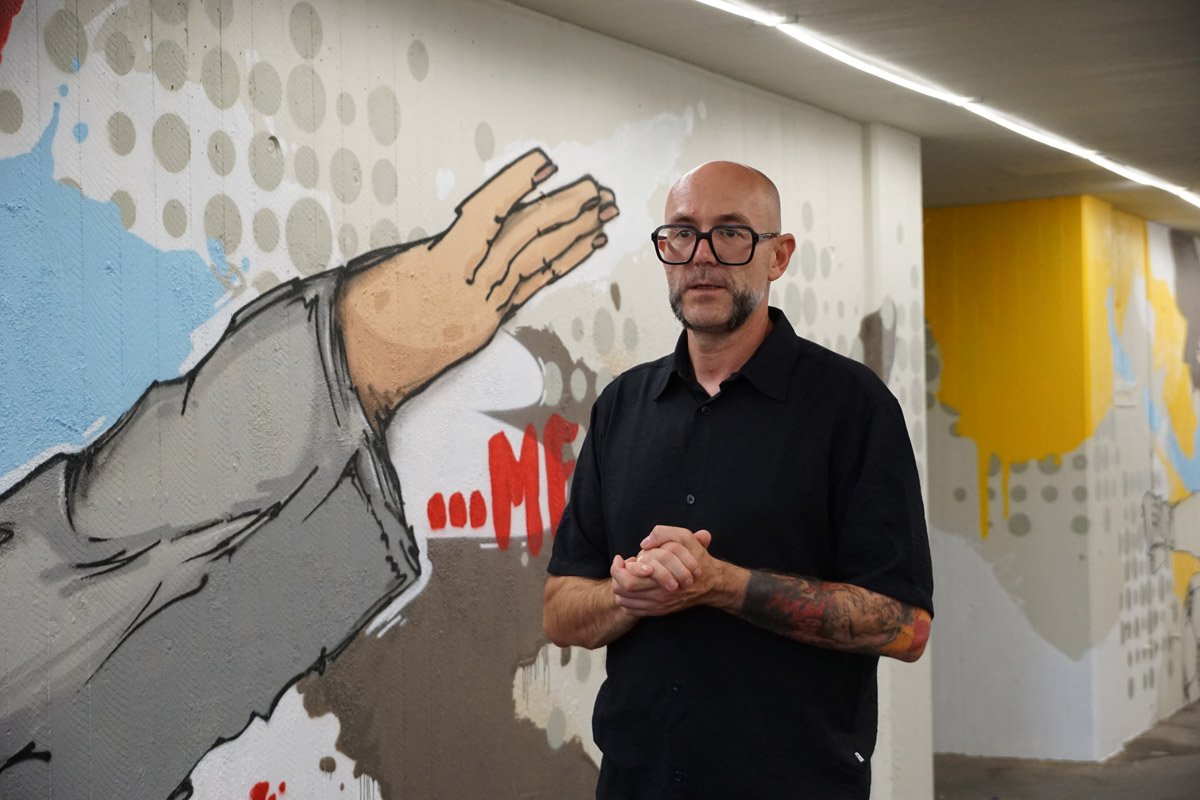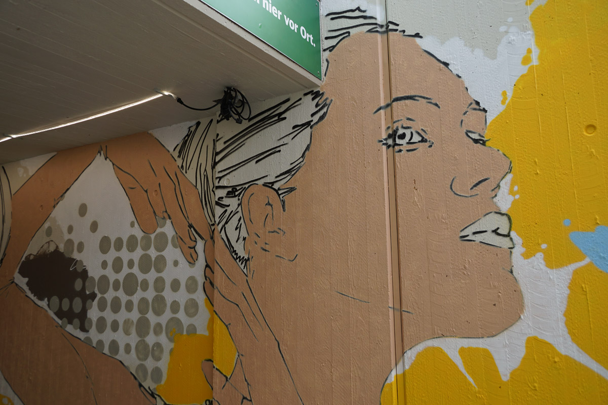 Technisch ist die Arbeit von Oliver Schwan ebenfalls interessant. Der Hintergrund wird gestrichen, dann bringt er die Grundzüge der Motive mithilfe einer VR-Brille auf – und am Ende wird mit Graffiti ausgemalt. Diese Technik spart viel Zeit, ansonsten wäre er, wie er berichtet, hier monatelang beschäftigt. Denn der Umfang des Kunstwerks ist enorm. Bewusst setzt er auf verlaufende Farben und verwendet Graffiti-Sprühdosen aus speziellen Geschäften für Künstlerbedarf. Ein ganzer blauer Sack leerer Dosen sei hier schon angefallen, so Schwan.