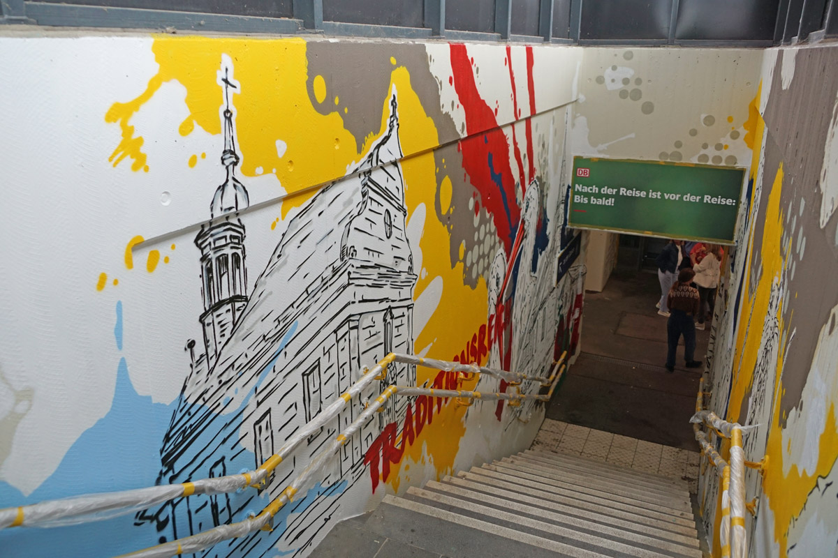 Für ein stimmiges Gesamtbild wurde die Gestaltung über die Unterführung hinaus in die Zugangsbereiche zu den Bahnsteigen weitergeführt. Und das war nicht selbstverständlich, wie Bürgermeisterin Sigrid Reinfelder erklärte. Denn für den Aufgang zu den Gleisen ist die Deutsche Bahn zuständig, für den Rest der Unterführung dagegen die Gemeinde Breitengüßbach. Die Überzeugungsarbeit von Rebecca Haas aus dem Architekturbüro Obrusnik, das die Gemeinde städtebaulich begleitet, habe sich aber gelohnt. So verbleiben keine grauen Betonbereiche mehr – und es werden, da ist sich Schwan sicher, auch weniger Anreize geboten, Schmierereien und andere Graffitis anzubringen.