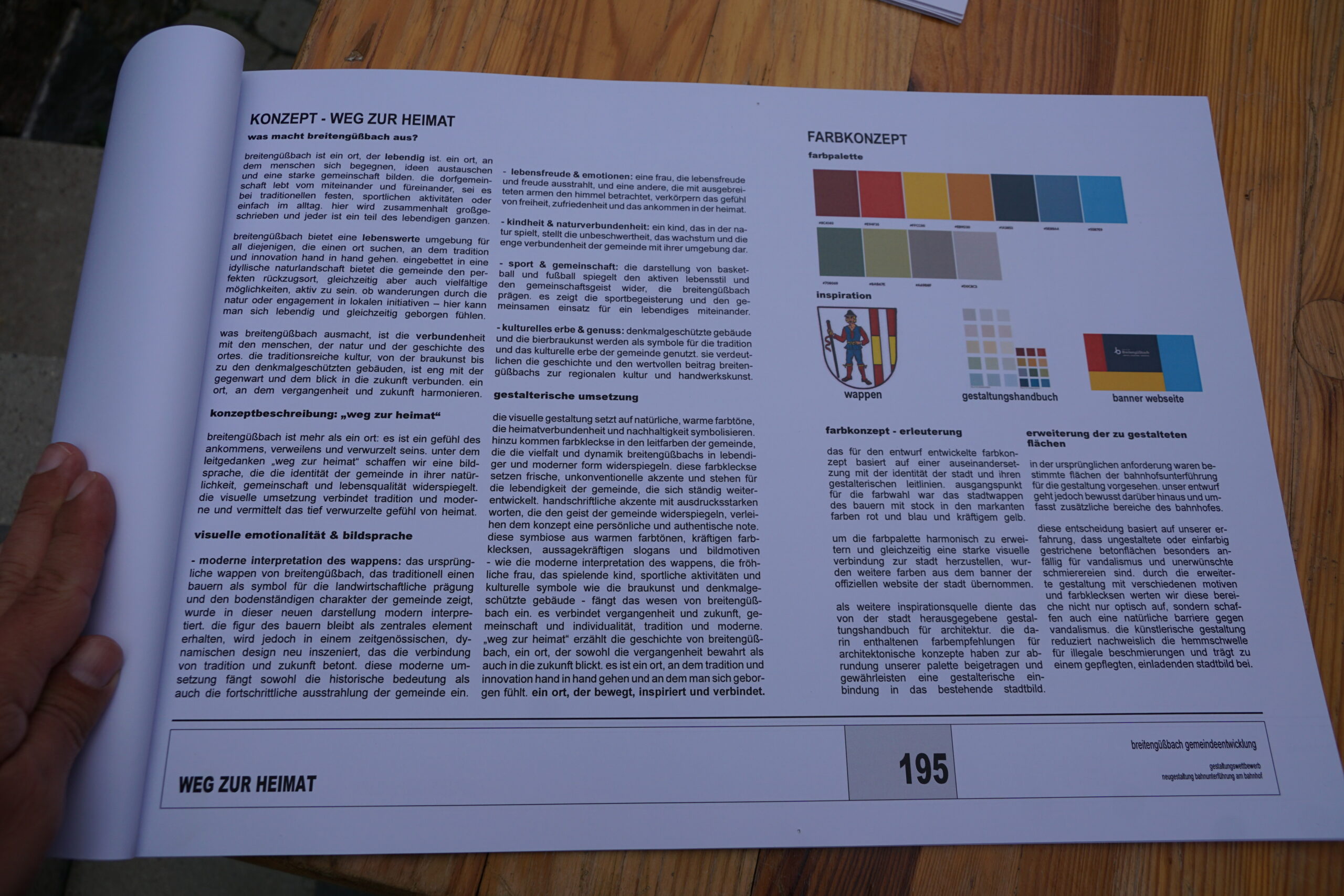 Dazu fand im Vorfeld ein Wettbewerb statt, bei dem sich die Ideen von Schwan gegen mehrere andere Einsendungen durchsetzten. Im Konzept nannte er sein Kunstwerk „Weg zur Heimat“. Es soll das Selbstverständnis von Breitengüßbach aufgreifen, als einen Ort, der Tradition und Zukunft verbindet und an dem sich Menschen geborgen fühlen. Die Leitmotive sind Lebensfreude, Kindheit und Naturverbundenheit, Gemeinschaft sowie Kultur und Genuss. Formal orientiert sich die Arbeit an einer warmen, natürlichen Farbwelt, die aus den Tönen des Gemeindewappens entwickelt und um Grün- und Blaunuancen ergänzt wurde. Große, klare Farbflächen, handschriftliche Akzente und eine reduzierte Bildsprache sorgen für gute Orientierung, eine freundliche Atmosphäre und einen robusten Auftritt, der auch im Alltag mit viel Publikumsverkehr funktioniert.