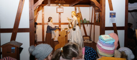 Beeindruckend geht es am nächsten Tag weiter. Ebenfalls mit einer Krippeneröffnung. Und zwar in Breitengüßbach. Hier begrüßt Rainer Hoffmann vom „Dorfkrippenverein Breitengüßbach“ die Besucherinnen und Besucher. Die Alphornbläser aus Kemmern umrahmen die ökumenische Feier zu Eröffnung, die Pfarrerin Susanne Wittmann-Schlechtweg und Kaplan Michael Moison begleiten. Klar wird auch hier: Eine solche Veranstaltung ist Tradition, die Krippe ebenso. Aber nicht nur. Sie gibt den Menschen, gerade in der heutigen Zeit, Halt – und macht nicht nur den Kindern Spaß. Rainer Hoffmann erklärt, dass sich das Krippenbild in der Advents- und Weihnachtszeit immer wieder verändert, und das die Kinder diesmal besonders gut hinschauen müssen. Denn in den drei Abteilungen der Krippe versteckt sich ein Hase, der den Platz wechselt und sich neue Verstecke sucht.
