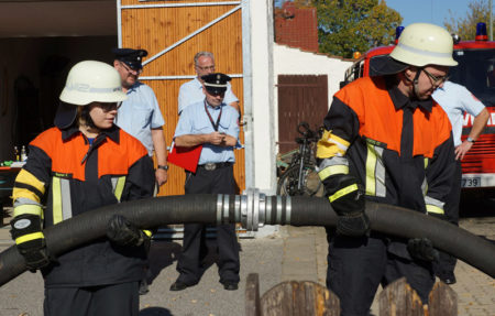 Gerade letzterer Punkt wurde schon 2015 bei einer gemeinsamen Leistungsprüfung [6] vertieft – und auch in diesem Jahr war es wieder soweit. Für zwei Gruppen aus Sassendorf und eine aus Hohengüßbach galt es, die verschiedensten Dinge in Sachen „Wasser“ innerhalb eines knappen Zeitfensters auszutesten. Dabei wird ein so genannter Löschangriff aufgebaut, die Feuerwehrmänner und -frauen sind in die verschiedenen notwendigen Bereiche eingeteilt. Bestanden haben alle drei Gruppen, die am Samstag, 13. Oktober, ab 9.30 Uhr in Hohengüßbach zusammengekommen waren. Zweimal wurde sogar das höchste Leistungsabzeichen „Gold-Rot“ erreicht – von Stefan Fuchs (Hohengüßbach) und Markus Weinkamm (Sassendorf).
