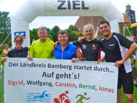 Sigrid Reinfelder, Wolfgang Möhrlein, Carsten Joneitis, Bernd Fricke und Jonas Merzbacher nach dem Triathlon.