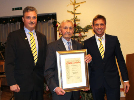 Für 70-jährige Vereinsmitgliedschaft mit der Goldenen Ehrennadel mit der Zahl „70“: Erstmals wurde ein Mitglied für 70 Jahre Vereinsmitgliedschaft ausgezeichnet. Neubauer freute sich sehr, Ehrenmitglied und Gründungsmitglied Adam Nüßlein bei guter Gesundheit und im stolzen Alter von 90 Jahren die Auszeichnung überreichen zu können.