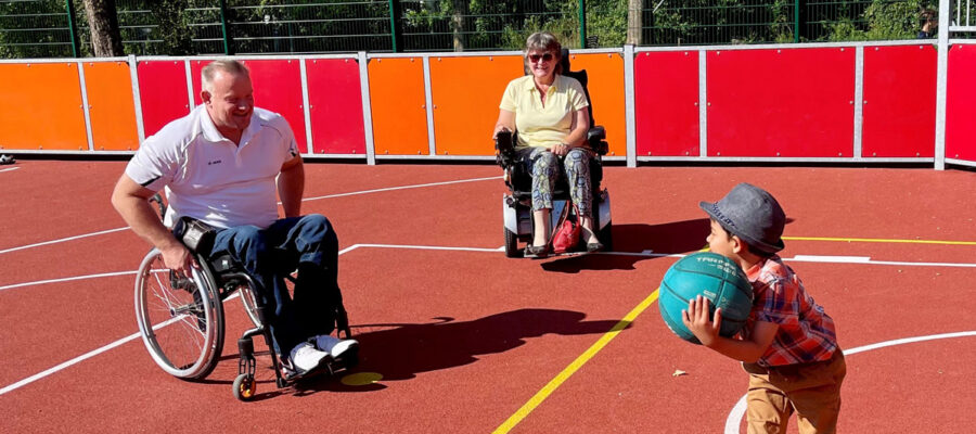 Ein dumpfer Aufprall, dann kullert der Ball über den ebenen Boden des Multifunktionspielfelds in Baunach. „Hier, Papa!“, ruft der vierjährige Leon und rennt dem Ball hinterher. Sein Vater, im Rollstuhl, dreht mit einem kräftigen Schwung an den Rädern und fängt den Pass ab. Sekunden später hebt er den Ball, wirft – und beide jubeln, als der Korb fällt.