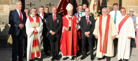 Begleitet von Marschmusikklängen der Stadtkapelle, unter der Leitung von Klaus Hittinger, formiert sich die Fahnenparade zur Pfarrkirche St. Kilian. Erwartet von vielen Gläubigen und von Erzbischof Dr. Ludwig Schick zieht die Festgemeinde im Gotteshaus unter Orgelklängen ein. Bei seiner Ansprache in der Pontifikalamt zum 150-jährigen Bestehen des Männervereins St. Kilian hebt der Erzbischof hervor „Katholische Männervereine ruhen traditionsgemäß auf fünf Säulen: Kirche, Familie, Beruf, Politik und Geselligkeit. Die Männervereine waren Schule für das christliche Leben und für kirchliche Aktivitäten in den Pfarreien, den Diözesen und der Weltkirche.“ Männervereine seien auch in Zukunft wichtig und könnten hilfreich sein. Sie sollten diese fünf Aufgaben im Blick behalten und erfüllen.