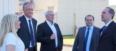 Werksleiter Christian Metzger, Landrat Johann Kalb, Europaministerin Melanie Huml, Bürgermeister Thomas Söder und Wirtschaftsminister Hubert Aiwanger führten Gespräche und schauten sich das Gelände genauer an.