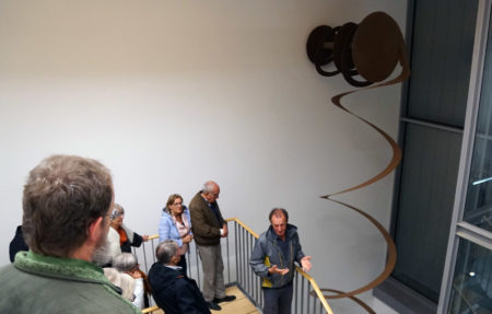 Kunst am Bau. Das fehlte noch im 2006 eröffnete Hallstadter Bürgerhaus. Und so wurde ein Wettbewerb ausgeschrieben, der Künstler Bernd Wagenhäuser ging als Sieger hervor. Im April 2008 schließlich wurde sein Kunstwerk der Öffentlichkeit vorgestellt – und seitdem hängt es im Treppenhaus des Bürgerhauses. Wagenhäusers Idee: Die Spirale, aus Cortenstahl gefertigt, nimmt die Formen der offenen Treppe auf und verweist zugleich auf die Wendeltreppe, die ins Obergeschoss führt. Am 25. September 2019 kehrte der Künstler nun ins Bürgerhaus zurück, zusammen mit den Teilnehmern seines Vortragsabends, der eigentlich in der Stadtbücherei stattfand. Der kurze Weg zwischen den Gebäuden machte aber diese kleine Exkursion möglich.