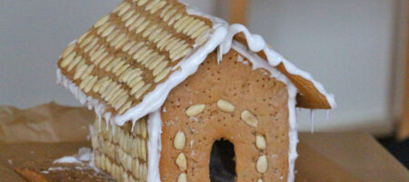 Natürlich darf auch jeder etwas von den fertigen Lebkuchenstangen schnabulieren. Das wird ein stabiles Haus, denn die Stangen sind knusprig, für die Senioren fast zu hart, aber geschmacklich kommen erste Weihnachtsgefühle auf. Als die Lebkuchenplatten durchgebacken und etwas abgekühlt sind, wird noch der „Kleber“ aus Eiklar, Zitronensaft und Puderzucker zusammen gerührt und mit einer Spritztülle aufgetragen. Viele Hände sind nötig, bis das Haus steht. Windschief sieht es aus, doch alle finden es sehr gelungen, sind stolz und zufrieden mit dem Werk und mit Bauherrin Brigitte Scholz.