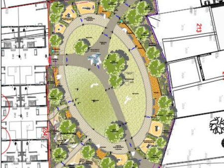 Der mittig angeordnete Brunnen in Variante 2A ist ebenerdig mit einer leichten Einsenkung und mit Fontänen und Steinen versehen, welche zum Verweilen einladen – vorausgesetzt der Brunnen ist abgeschaltet. Bei diesem Entwurf wird die Wiese von einer Staudenbepflanzung begrenzt – als Abgrenzung zum ovalen Loopweg. Die Variante 2B ist eine reduzierte Version der Variante 2A. Die begrenzenden Pflanzen werden weggelassen, sodass ein guter Übergang vom Weg zur Wiese entstehen kann, so Dittrich. Weiterhin wird der Kinderspielplatz um ein Spielgerät ausgeweitet und ein zusätzlicher Baum rundet diese Variante ab.